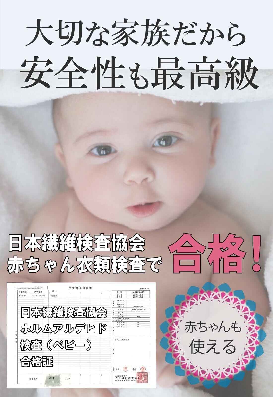 タオル 安全と法令遵守にもこだわりました。 大事な家族に安全検査をしていない物を使えますか? 赤ちゃんの肌着と同じ検査で合格! 安全検査もしていない素材を使いたくない飼い主様のお声に答えました。 市場でブランケットに洗濯タグも付いていない商品もありました。 洗濯の方法と会社名をタグに入れるのは「家庭用品品質表示法」の法令を遵守したからです。