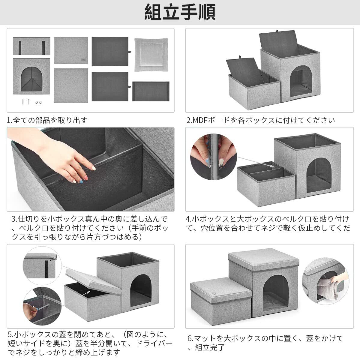 【お休みができる隠れ家】size:70x39x39cm 重量:3.5kg.一階段の中で、収納空間があります。特別な設計で、大きい隠れ家での猫ちゃんパーソナルスペースを確保できます。柔らかいシートで寝心地がステキです。穴を出したおネコちゃんの顔を見て、癒されます。
