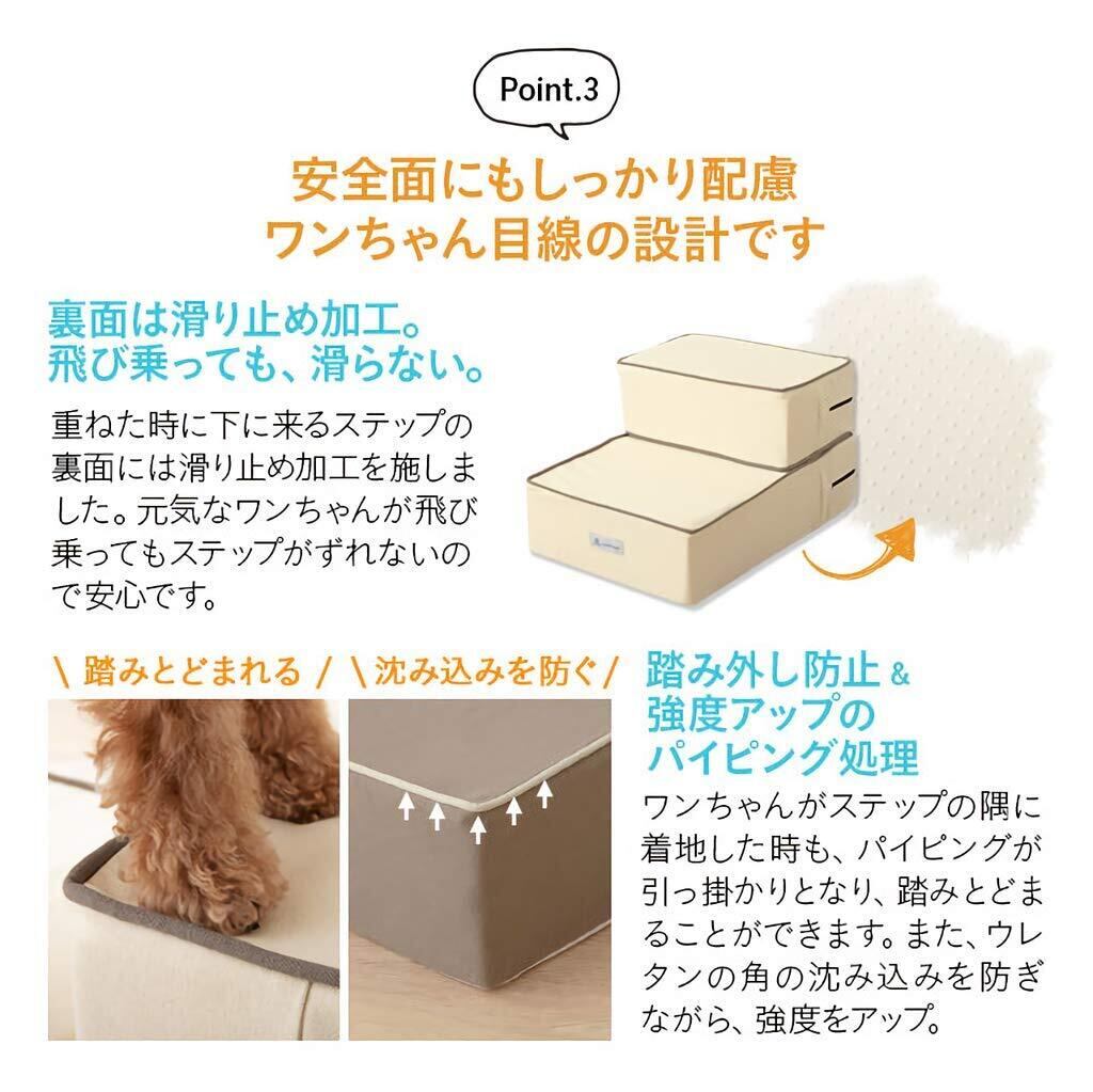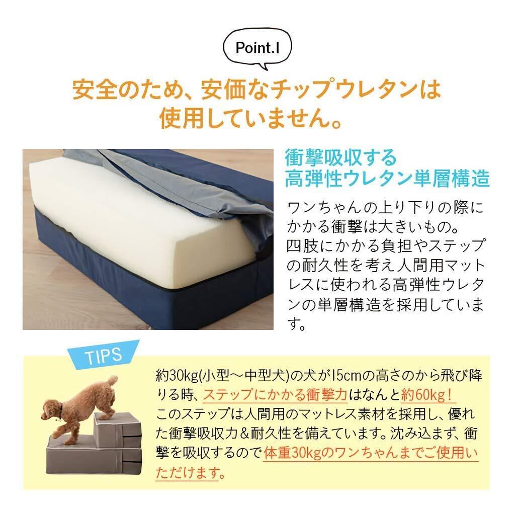Point.1 安全のため、安価なチップウレタンは使用していません。 ワンちゃんの上り下りの際にかかる衝撃は大きいもの。 四肢にかかる負担やステップの耐久性を考え 人間用マットレスに使われる高弾性ウレタンの単層構造を採用しています。 Point.2 滑りにくさを追求。生地にも、細部にもこだわりを。 綿100%オックス生地を採用しました。 カバーは洗濯機でお洗濯が可能です。 汚れても洗えるので、やんちゃなワンちゃんのオーナー様も安心ですね。 カバーのファスナーはしっかり隠せる仕様を採用しました。 ファスナーなどをかじってしまうワンちゃんも、これなら安心です。