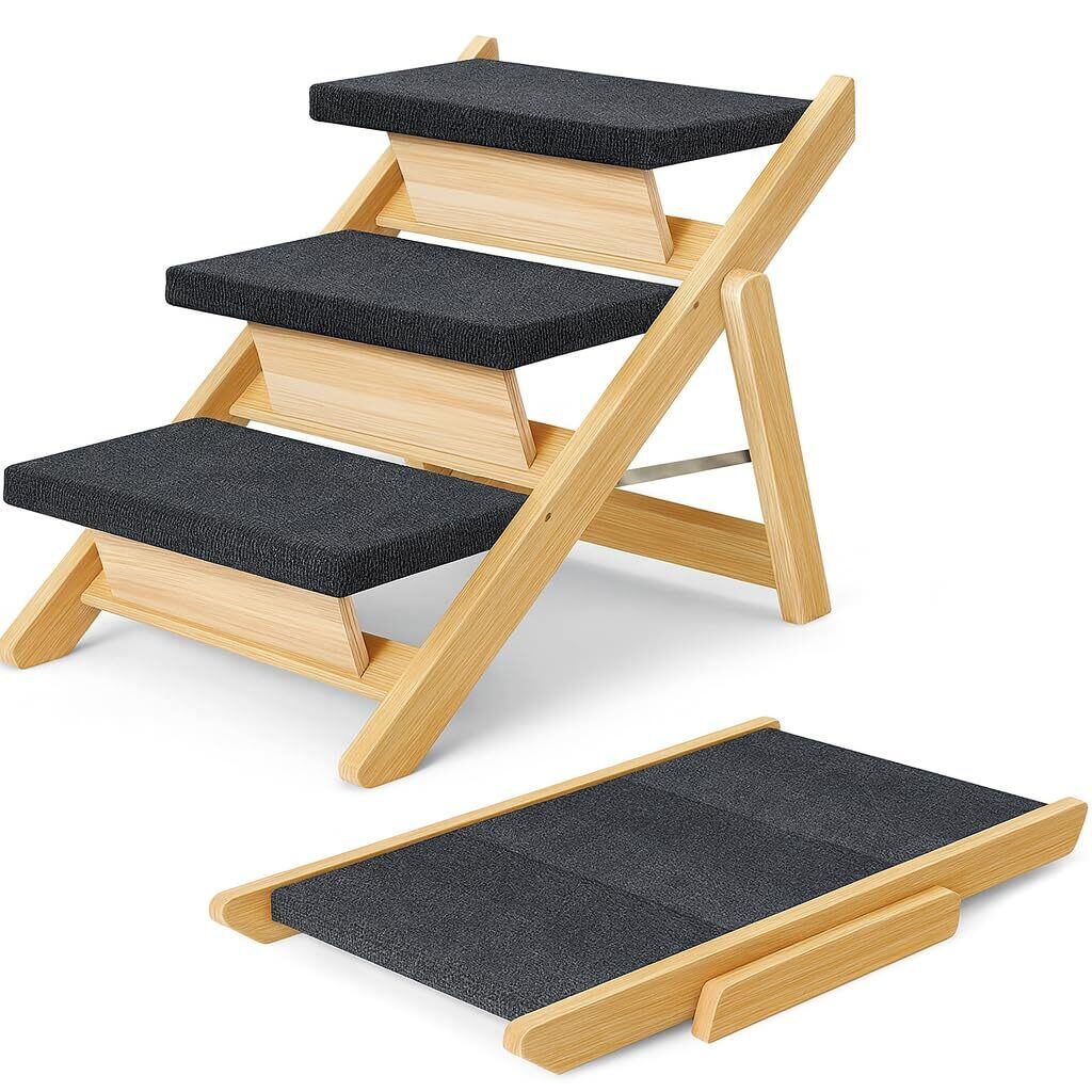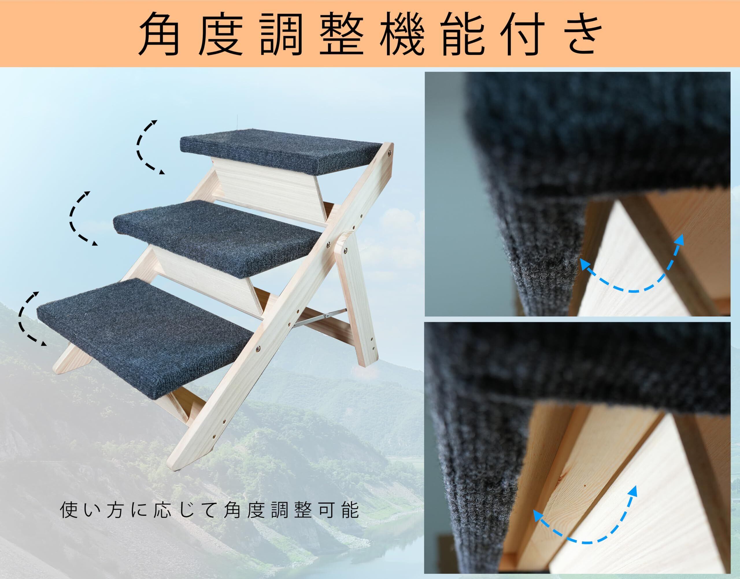 ペット階段 犬用ステップ 犬用階段 犬 スロープ 天然木材製 折りたたみ 角度調整可能 滑り止めマット付き 犬用踏み台 小型犬 中型犬 高齢犬用 収納便利(木色, L, 1)