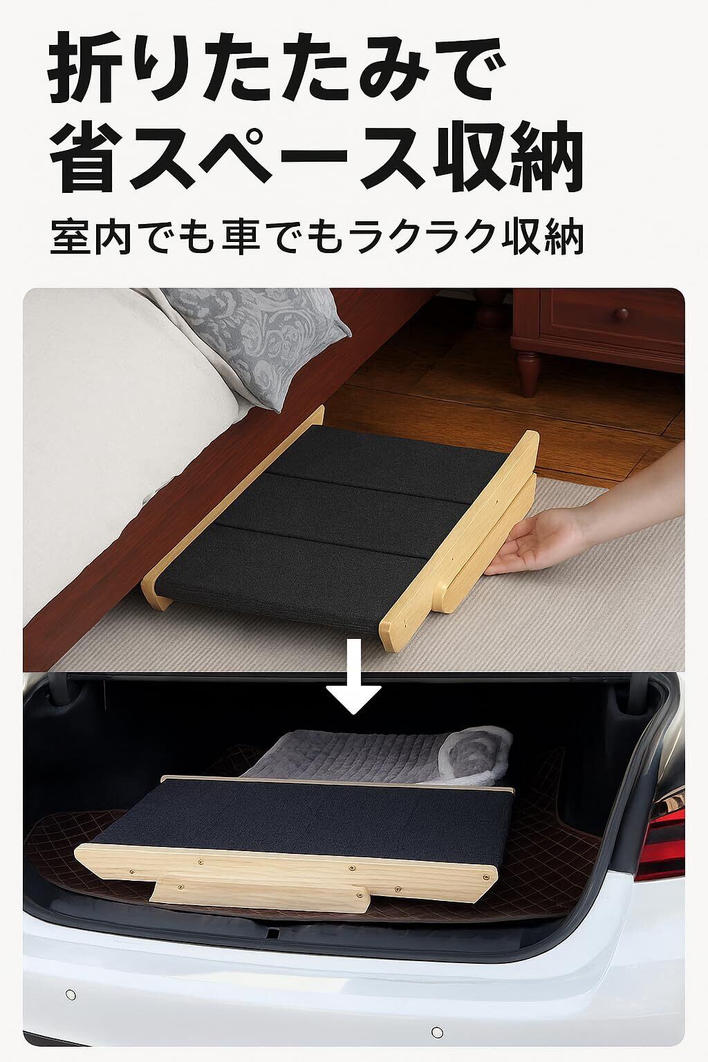 ③ 高さ・角度調整可能で快適 高さや角度を自由に調整でき、ソファやベッドの高さに合わせて利用可能。犬 スロープとしても機能し、シニア犬や足腰の弱い犬の負担を軽減します。