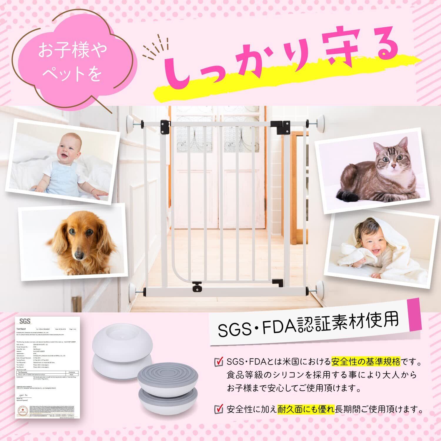 【素材/外観】 安全規格のSGS/FDA認証取得済みの素材(食品等級シリコン)+ 非毒性ABSを使用していますので、 赤ちゃんはもちろん犬、猫、ペット用ゲート、柵に安心してご使用いただけます。 ホワイトを基調としたシンプルな外観で場所を選ばずご使用いただけます。※お知らせ※2022年2月下旬より底面デザインが一新されました。よりホールド出来るよう滑り止め接地面が増えました。商品や仕様、用途につきましては今までのものと変わりはございませんので、引き続きご愛顧くださいますようお願いいたします。