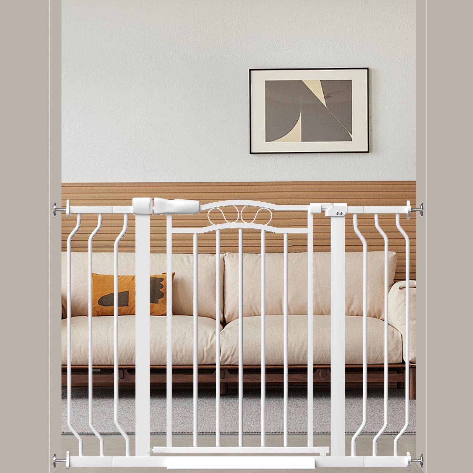 多様な設置場所:ベビーゲートは拡張フレームを使用することで、最大幅206cmまでの設置が可能です。このベビーゲートは、階段、ドアの入口、廊下など、さまざまな場所に柔軟に設置でき、特に階段の上部や出入口に設置することで、子供が危険なエリアに入るのを効果的に防ぎます。ベビーゲートはペットを飼っている家庭にも最適です。