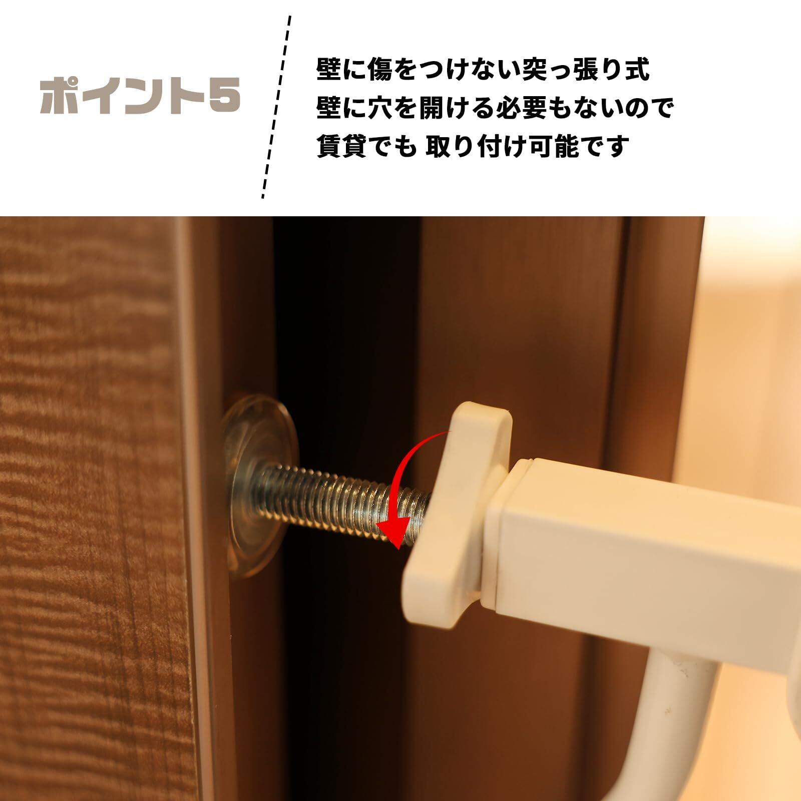 簡単な組み立てと突っ張り式:ベビーゲートは突っ張り式の取り付け方式を採用しており、壁に穴を開ける必要がなく、取り外しも簡単で、壁を傷つけません。ベビーゲートはさまざまな幅のドア枠や階段通路に対応できる拡張機能もあります。ベビーゲートは壁に穴を開ける必要がないため、賃貸住宅でも取り付け可能です。一人でも簡単に設置でき、複雑な工具は不要で、ネジを回すだけで取り付けが可能です。ベビーゲートは説明書に従って設置すれば、約15分で完了します。さらに、危険な場所に設置する際には、ネジで壁に固定することで、より安全性を高めることができます。