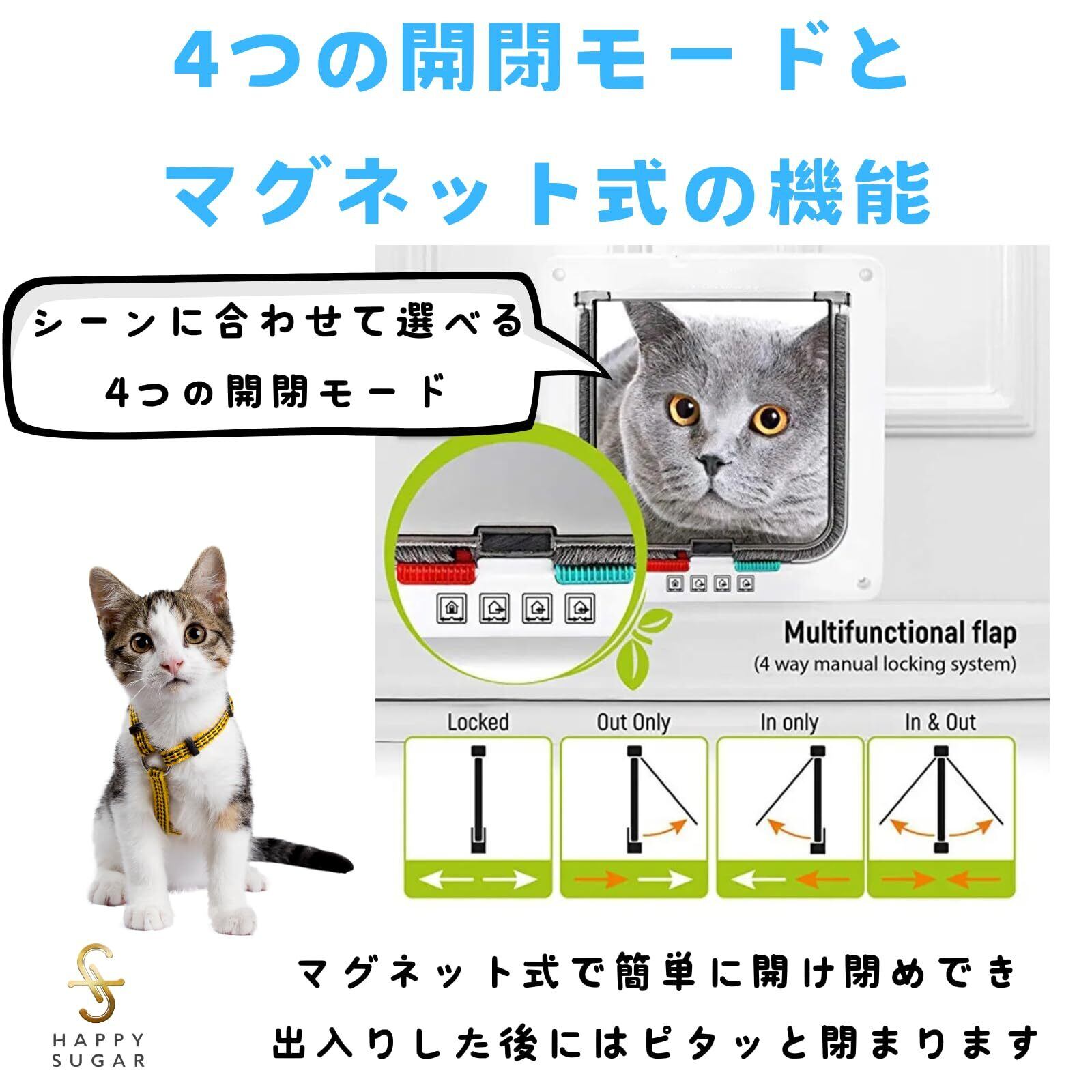 【4つの開閉モードとマグネット式の機能】シーンに合わせて選べる4つの開閉モードがあり、ペットの出入りに最適な設定ができます。さらに、マグネット式で簡単に開け閉めでき、ペットが出入りした後にはピタッと閉まるので、開けっぱなしの心配もありません。