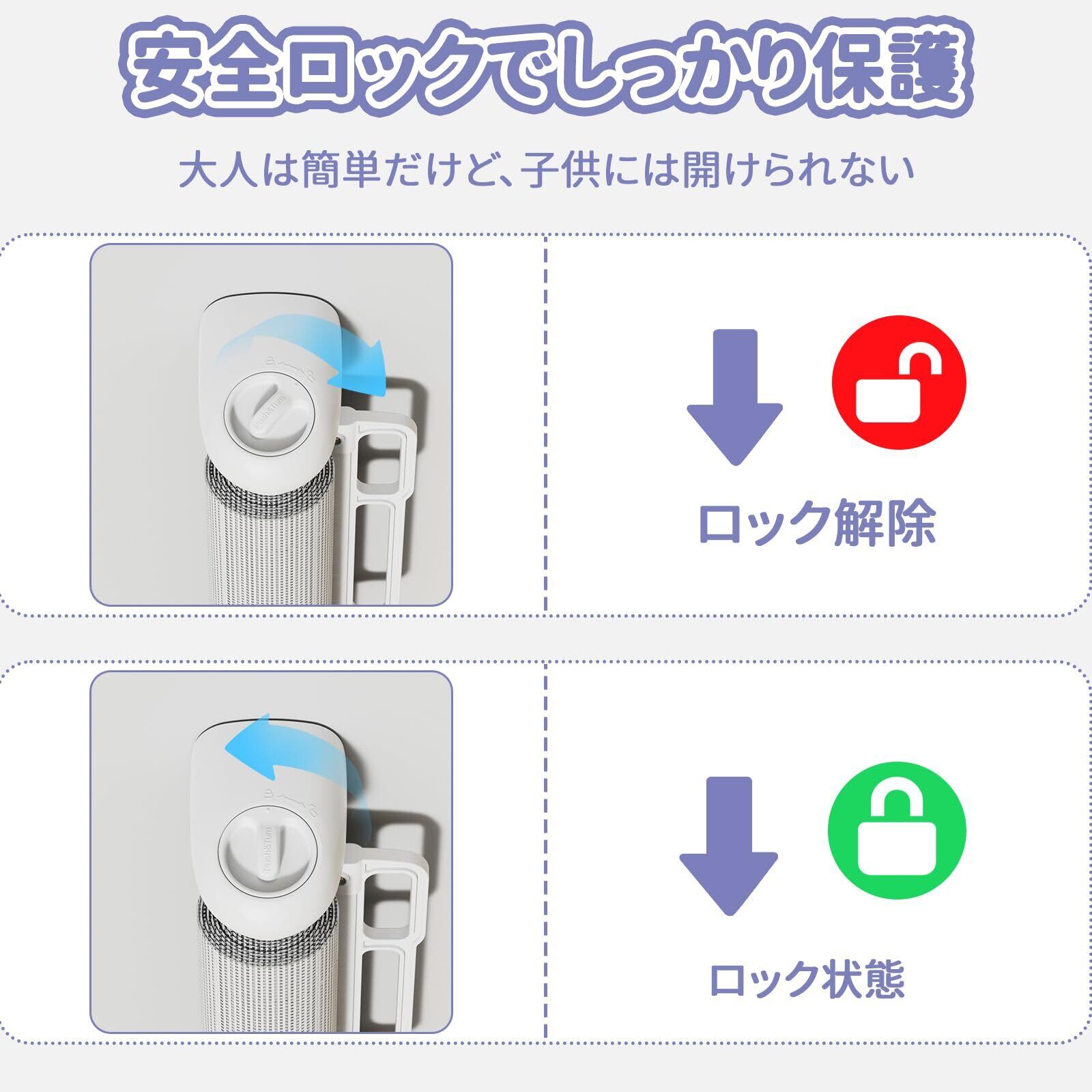 【安全ロック設計】操作が簡単で、片手でゲートを開けることができます。ボタンを押してロックアイコンに回転して、メッシュはロック状態となり固定します 、アンロックアイコンを回転して、メッシュが正常に伸張することができます。フックに掛けられているとき、安全ロックをロック状態になると、メッシュを移動することができません。