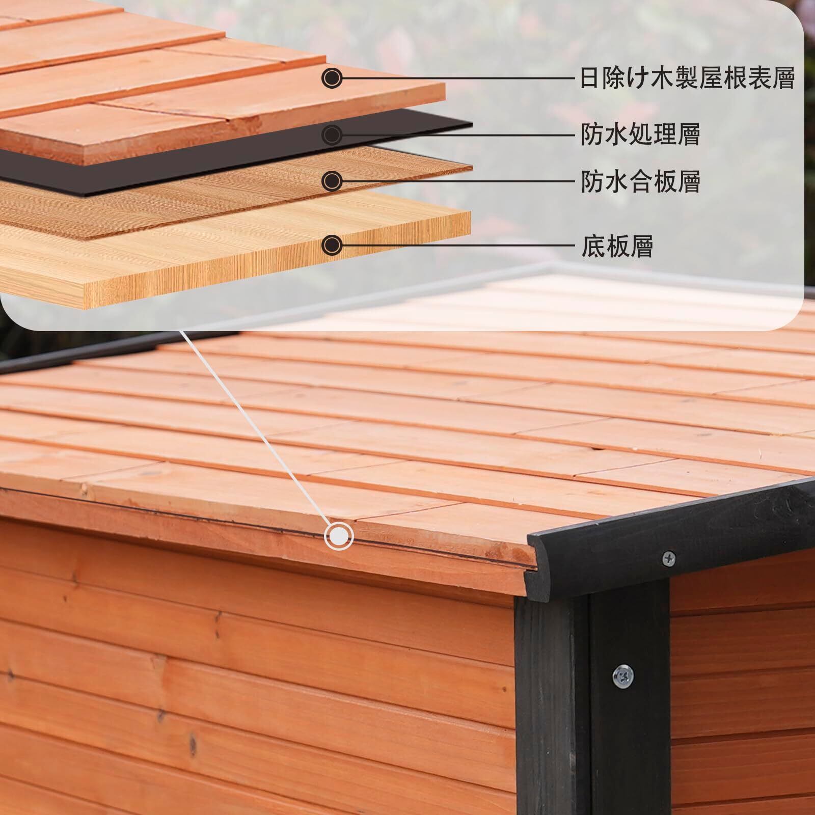 【多層構造の防水ルーフ】屋根は、日差しを遮る木製表層、厳重な防水処理層、頑丈な防水合板層、そして耐久性を支える底板層の多層構造により、雨水や湿気の侵入を徹底的に防ぎ、常にドライで快適な居住空間をペットに提供します。