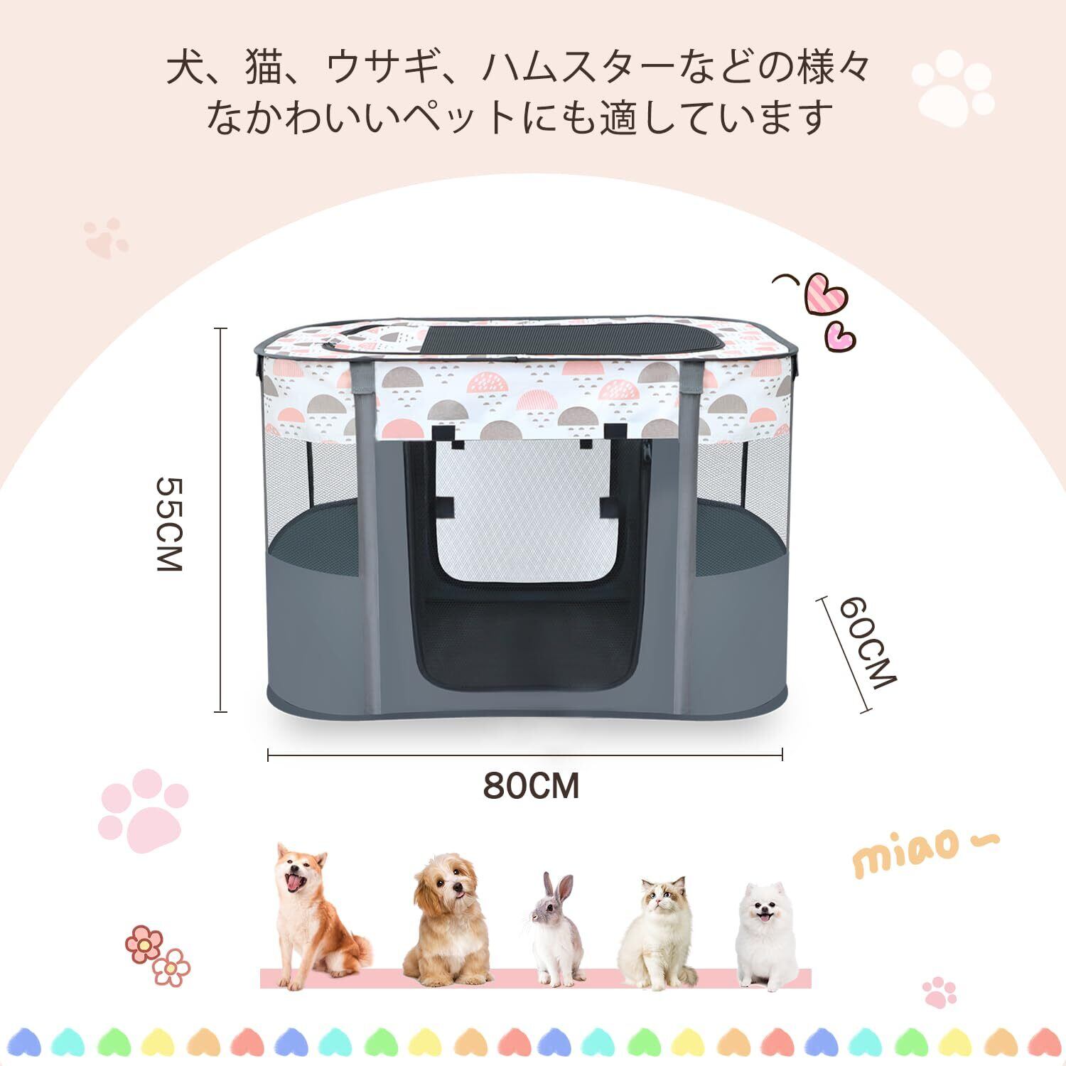 【商品仕様】折畳みサークル*1、支柱*8、キャリーバッグ*1、80*60*55cm(組み立て)、材質:300Dオックスフォード。5面の通気性メッシュにより、自由に呼吸できます。 大きなパノラマ サンルーフは、半分または全開にして、いつでもペットを観察したり触れ合ったりすることができます。