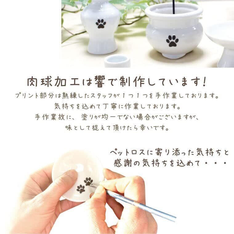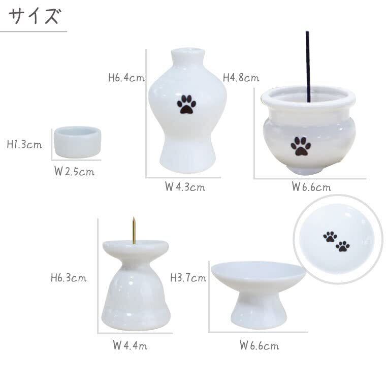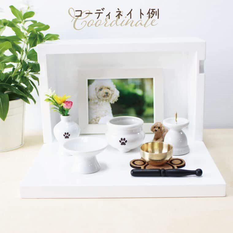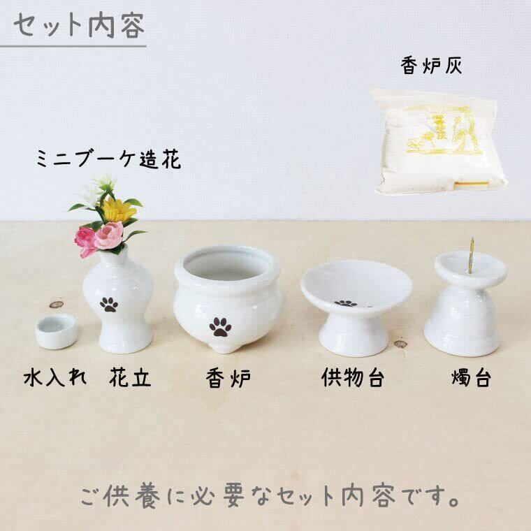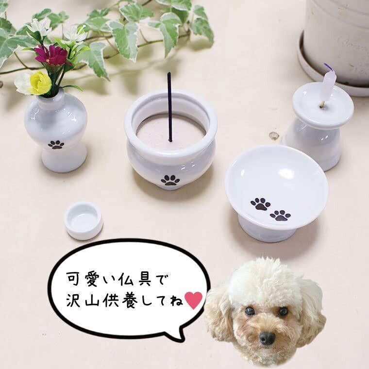 白磁器のかわいいミニ仏具。当店オリジナルの肉球(ブラウン箔)入り。小さくて可愛いのでスペースがない方でも置いて頂けます。