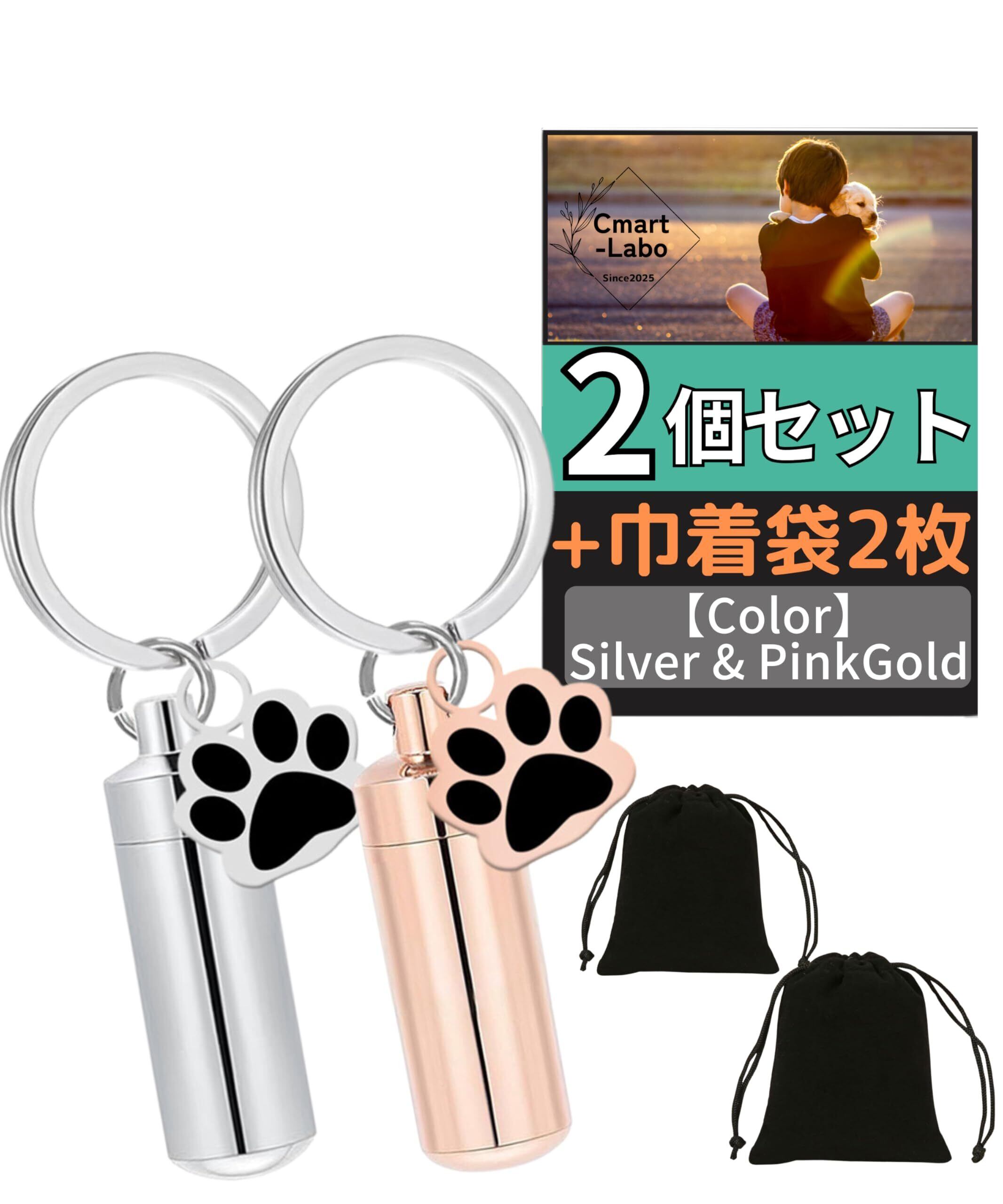 【新着商品】[Cmart-Labo] 遺骨 キーホルダー 2個セット ミニ巾着付き シルバー&ピンク ペンダント 遺骨入れ 遺毛ケース ペット 骨壺 カプセル メモリアル | wakuwakuland