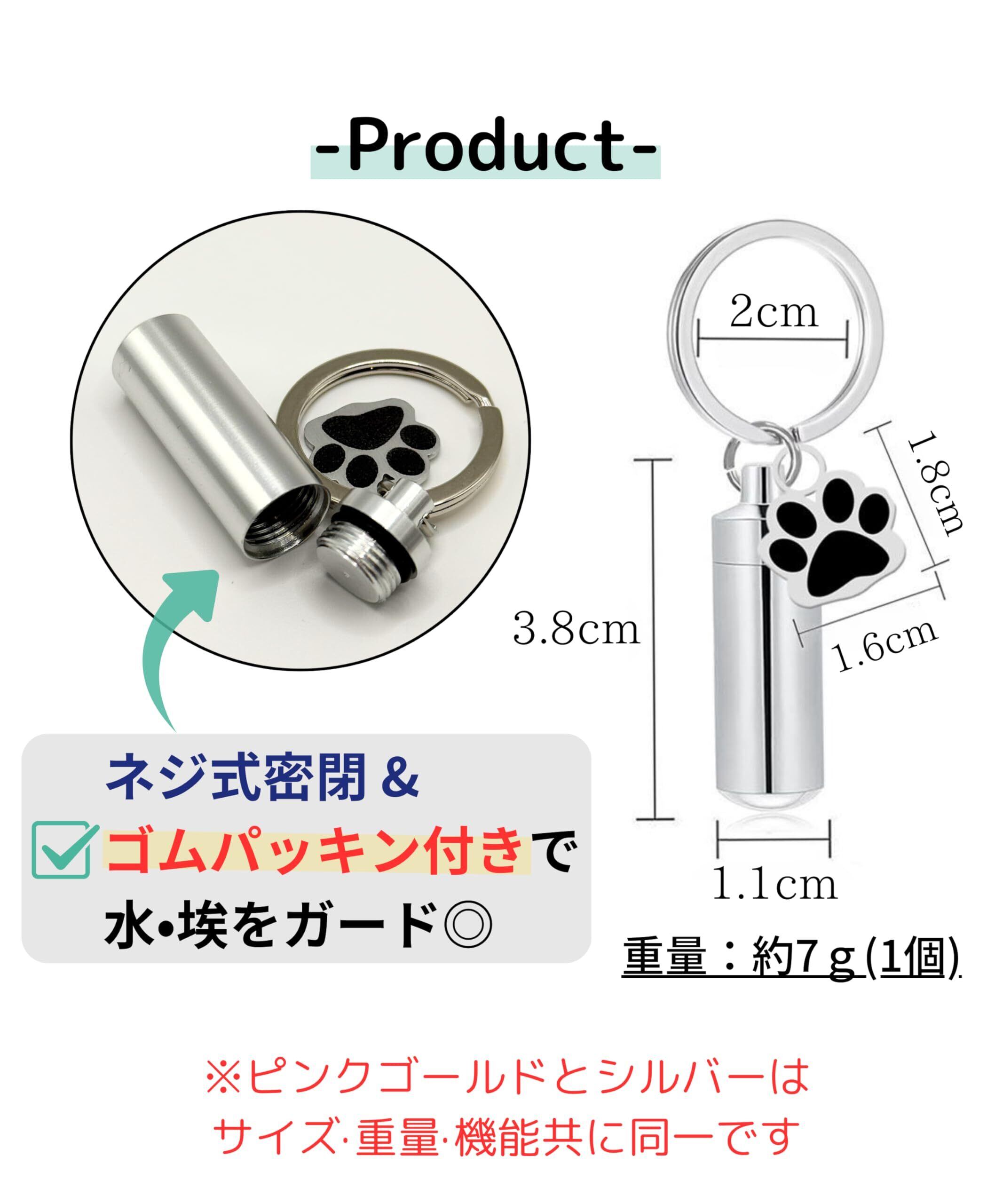 愛犬のぬくもりを、いつもそばに。 大切な存在を亡くした悲しみに寄り添う「遺骨 キーホルダー 2個セット」。シルバーとピンクゴールドの2色入りで、夫婦や家族でそれぞれの想いを胸に刻めます。 さらに、個別の収納用巾着も2個セット。持ち歩くときも優しく包み、そっと心を支えてくれます。 ステンレス製・防水設計で、日常使いでも安心。ネジ式でしっかりと密閉し、遺骨・毛・爪など大切な形見を丁寧に保管できます。 シンプルで上品なデザインは、アクセサリーのように自然に持ち歩けて、心のお守りとしてそっと寄り添います。