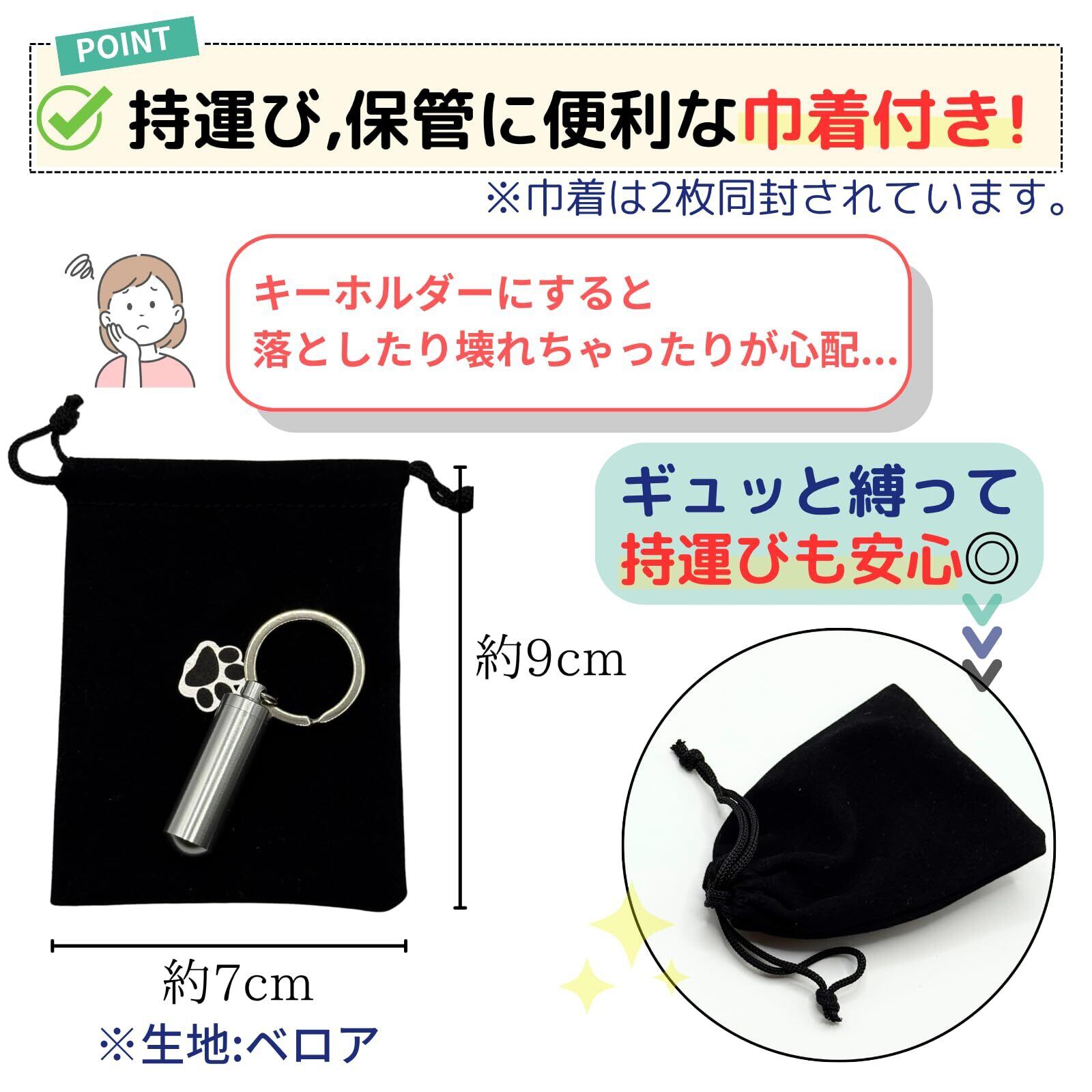 製品使用方法:ネジ蓋を開けて遺骨・毛・爪などを納める。しっかり密閉し、キーホルダーとして持ち運ぶ又は付属の巾着に入れて保管する。