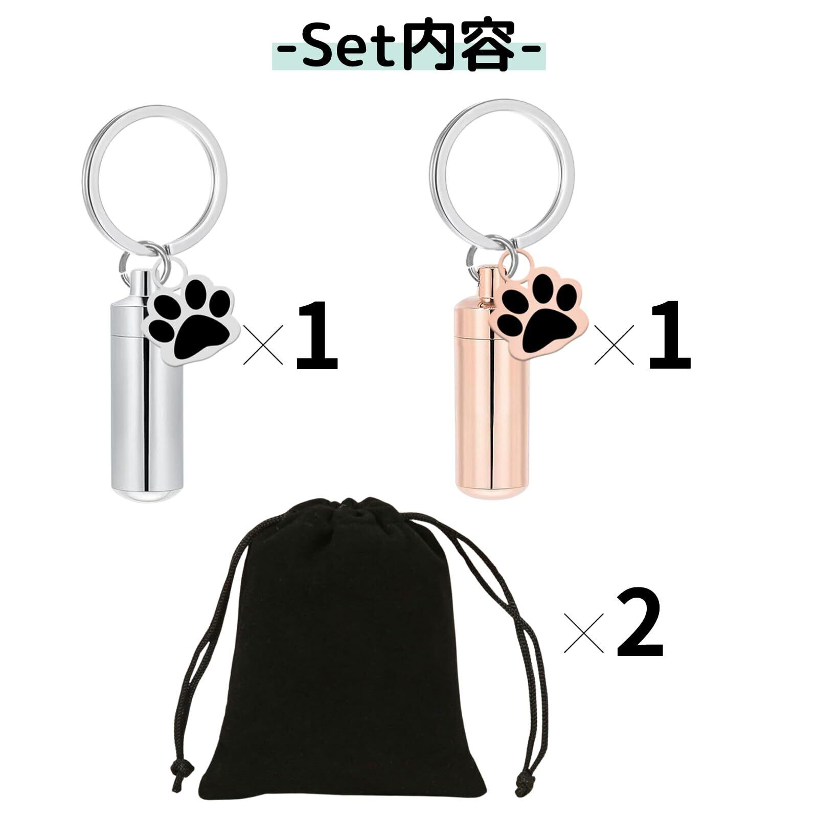 製品概要:ペットの遺骨を納められる、シルバー&ピンクゴールドのキーホルダー2個セット。さらに、それぞれを個別に収納できる専用巾着も2個付属。