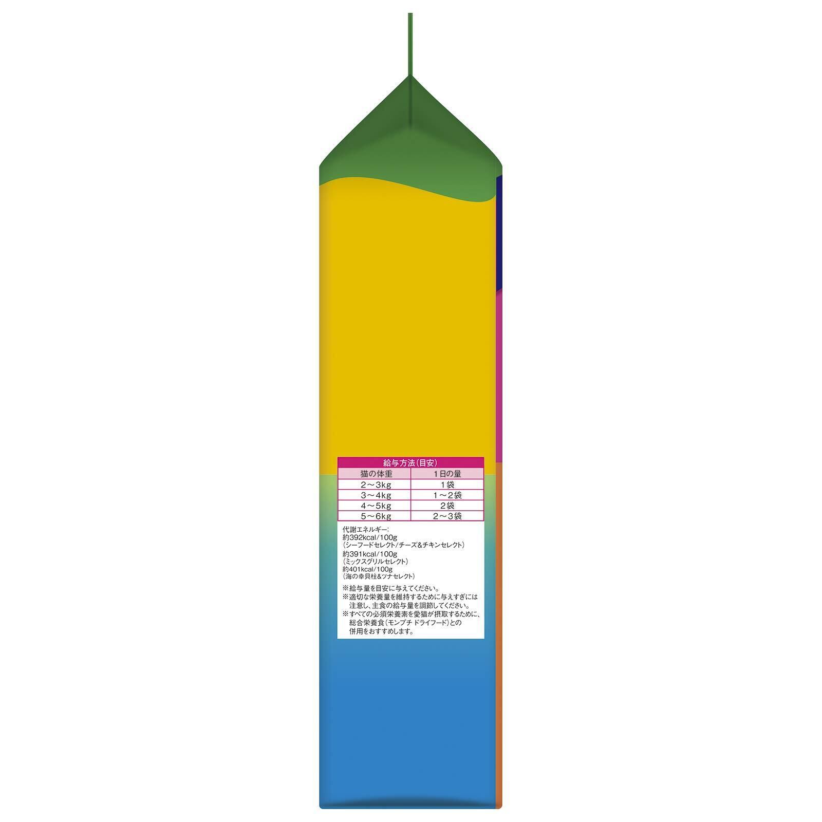 原材料:<シーフードセレクト> 白身魚、チキンミール、米、家禽ミール、牛脂、えんどう豆でんぷん、大麦、コーングルテン、たんぱく加水分解物、キャッサバ粉、モルトエキス、ぶどう糖、酵母、ツナパウダー、えびパウダー、かにパウダー、ミネラル類(カルシウム、カリウム、ナトリウム、クロライド、鉄、銅、マンガン、亜鉛、ヨウ素、セレン)、酸味料、アミノ酸類(グリシン、タウリン)、ビタミン類(A、D、E、K、B1、B2、パントテン酸、ナイアシン、B6、葉酸、ビオチン、B12、コリン、C)、着色料(食用赤色40号、食用青色2号、食用黄色4号、食用黄色5号)、酸化防止剤(ブチルヒドロキシアニソール、ジブチルヒドロキシトルエン、ミックストコフェロール) <チーズ&チキンセレクト> チキンミール、白身魚、米、牛脂、えんどう豆でんぷん、コーングルテン、大麦、たんぱく加水分解物、酵母、ターキーミール、キャッサバ粉、モルトエキス、ぶどう糖、チーズ、ミネラル類(カルシウム、カリウム、ナトリウム、クロライド、鉄、銅、マンガン、亜鉛、ヨウ素、セレン)、酸味料、アミノ酸類(グリシン、タウリン)、ビタミン類(A、D、E、K、B1、B2、パントテン酸、ナイアシン、B6、葉酸、ビオチン、B12、コリン、C)、着色料(食用赤色40号、食用青色2号、食用黄色4号、食用黄色5号)、酸化防止剤(ブチルヒドロキシアニソール、ジブチルヒドロキシトルエン、ミックストコフェロール) <ミックスグリルセレクト> チキンミール、チキン、米、牛脂、えんどう豆でんぷん、大麦、コーングルテン、たんぱく加水分解物、キャッサバ粉、モルトエキス、ぶどう糖、酵母、サーモンパウダー、ミネラル類(カルシウム、カリウム、ナトリウム、クロライド、鉄、銅、マンガン、亜鉛、ヨウ素、セレン)、酸味料、アミノ酸類(グリシン、タウリン)、ビタミン類(A、D、E、K、B1、B2、パントテン酸、ナイアシン、B6、葉酸、ビオチン、B12、コリン、C)、着色料(食用赤色40号、食用青色2号、食用黄色4号、食用黄色5号)、酸化防止剤(ブチルヒドロキシアニソール、ジブチルヒドロキシトルエン、ミックストコフェロール) <海の幸 貝柱&ツナセレクト> 白身魚、チキン、米、チキンミール、牛脂、えんどう豆でんぷん、コーングルテン、大麦、たんぱく加水分解物、キャッサバ粉、モルトエキス、酵母、ぶどう糖、ツナパウダー、えびパウダー、ロブスターエキスパウダー、貝柱エキスパウダー、ミネラル類(カルシウム、カリウム、ナトリウム、クロライド、鉄、銅、マンガン、亜鉛、ヨウ素、セレン)、酸味料、アミノ酸類(グリシン、タウリン)、ビタミン類(A、D、E、K、B1、B2、パントテン酸、ナイアシン、B6、葉酸、ビオチン、B12、コリン、C)、着色料(食用赤色40号、食用青色2号、食用黄色4号、食用黄色5号)、酸化防止剤(ブチルヒドロキシアニソール、ジブチルヒドロキシトルエン、ミックストコフェロール)