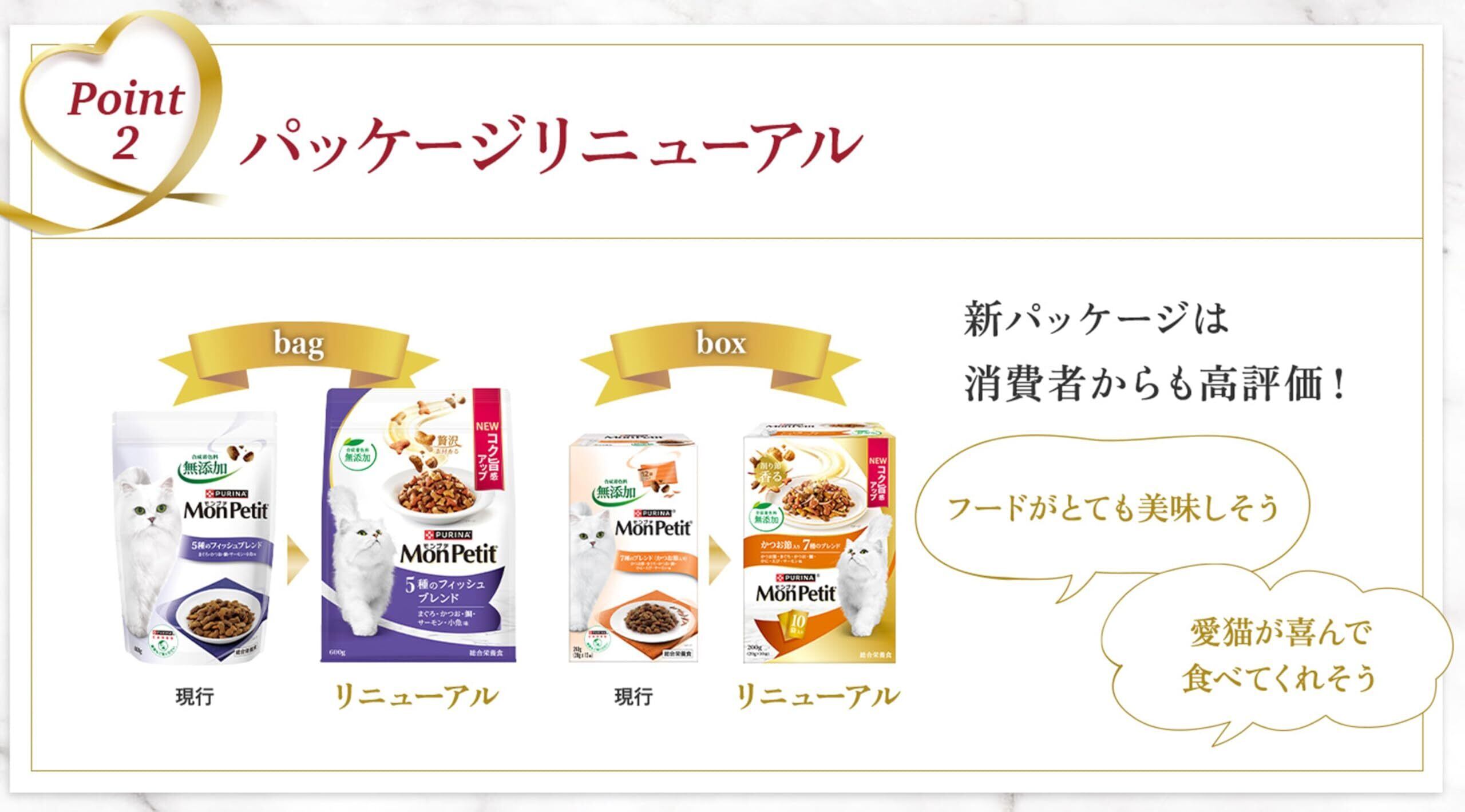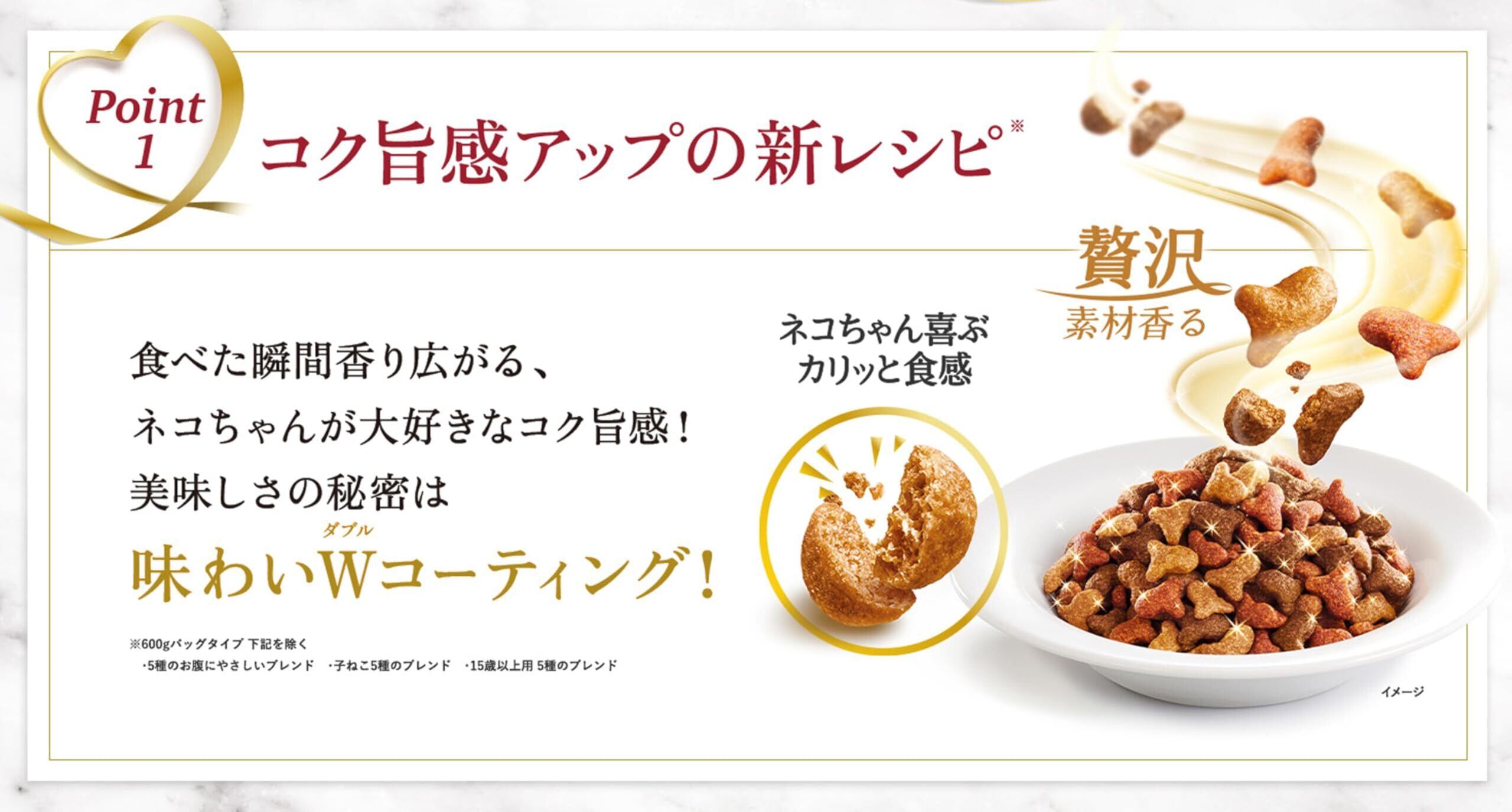 原材料:穀類(とうもろこし、とうもろこしたんぱく、小麦、米、オーツ麦等)、肉類(家禽ミール等)、脱脂大豆、食物繊維(ビートパルプ、ライスブラン、セルロース等)、動物性油脂、魚介類(まぐろ、かつお)、たんぱく加水分解物、フレーバーブレンド(鯛、海藻等)、ミネラル類(カルシウム、リン、カリウム、ナトリウム、クロライド、鉄、銅、マンガン、亜鉛、ヨウ素、セレン)、ビタミン類(A、E、B1、B2、パントテン酸、ナイアシン、B6、葉酸、ビオチン、B12、コリン)、アミノ酸類(メチオニン、タウリン)、着色料(カラメル色素、カロテノイド色素)