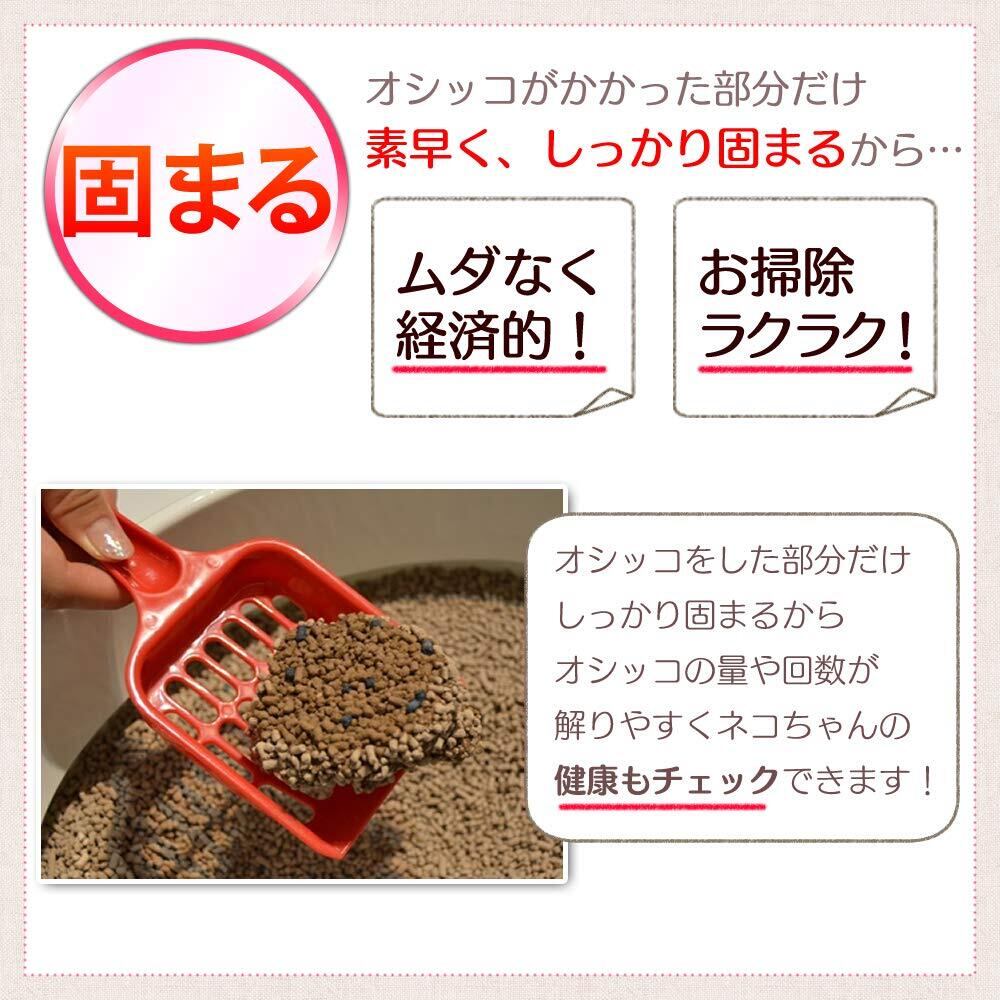 【商品説明】:木を原料とした、燃えるゴミとして処理できるネコ砂です。「固まる+脱臭」効果の木製の猫砂です。抗菌粒を配合しています。燃えるゴミとして処理できます。