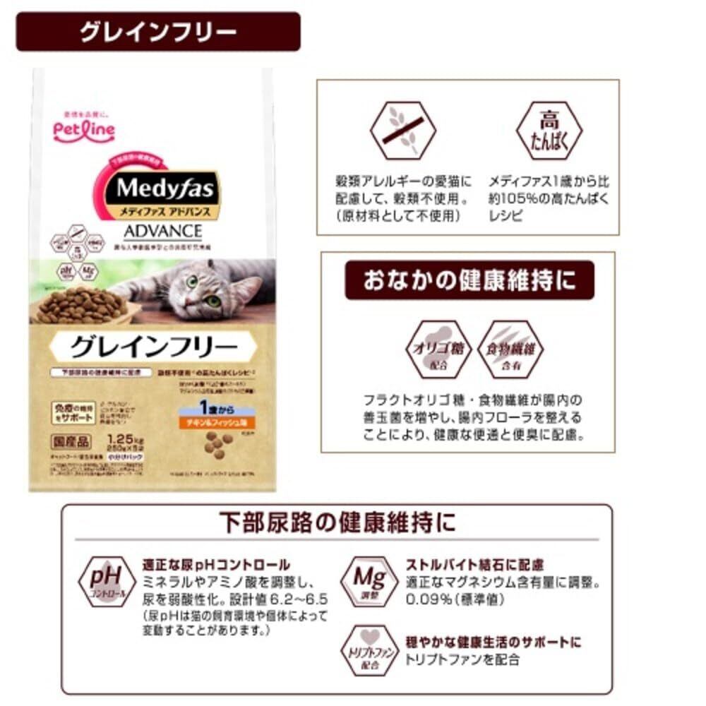 麻布大学獣医学部と共同研究開発を行った「下部尿路の健康維持」に加え、様々な健康ニーズにきめ細かく対応したアイテム展開。β-グルカン、ビタミン配合で健康を維持し免疫を保ちます。メディファスアドバンスは、愛猫の末永い幸せを願い、より進化した価値をお届けします。グレインフリーと下部尿路の健康維持を両立。フラクトオリゴ糖、繊維源(セルロース)配合で、健康な便通と便臭に配慮。チキン&フィッシュ味。 ◎尿pH設計値6.2~6.5 ◎マグネシウム含有量0.09%(標準値)