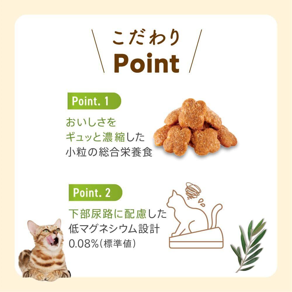 穀類(トウモロコシ、コーングルテンミール、小麦粉、パン粉)、肉類(牛肉粉、豚肉粉、チキンミール、フリーズドライ鶏肉、チキンレバーパウダー)、α化でん粉、油脂類(動物性油脂、植物性油脂(ピュアオリーブオイル含む))、魚介類(カツオブシ、フィッシュパウダー、マグロ節粉)、オリゴ糖、ミネラル類(カルシウム、リン、カリウム、ナトリウム、クロライド、銅、亜鉛、ヨウ素)、pH調整剤、酵母細胞壁、アミノ酸類(タウリン、トリプトファン、メチオニン)、ビタミン類(A、B1、B2、B6、B12、D、E、K、ニコチン酸、パントテン酸、葉酸、コリン)、酸化防止剤(ミックストコフェロール、ローズマリー抽出物)