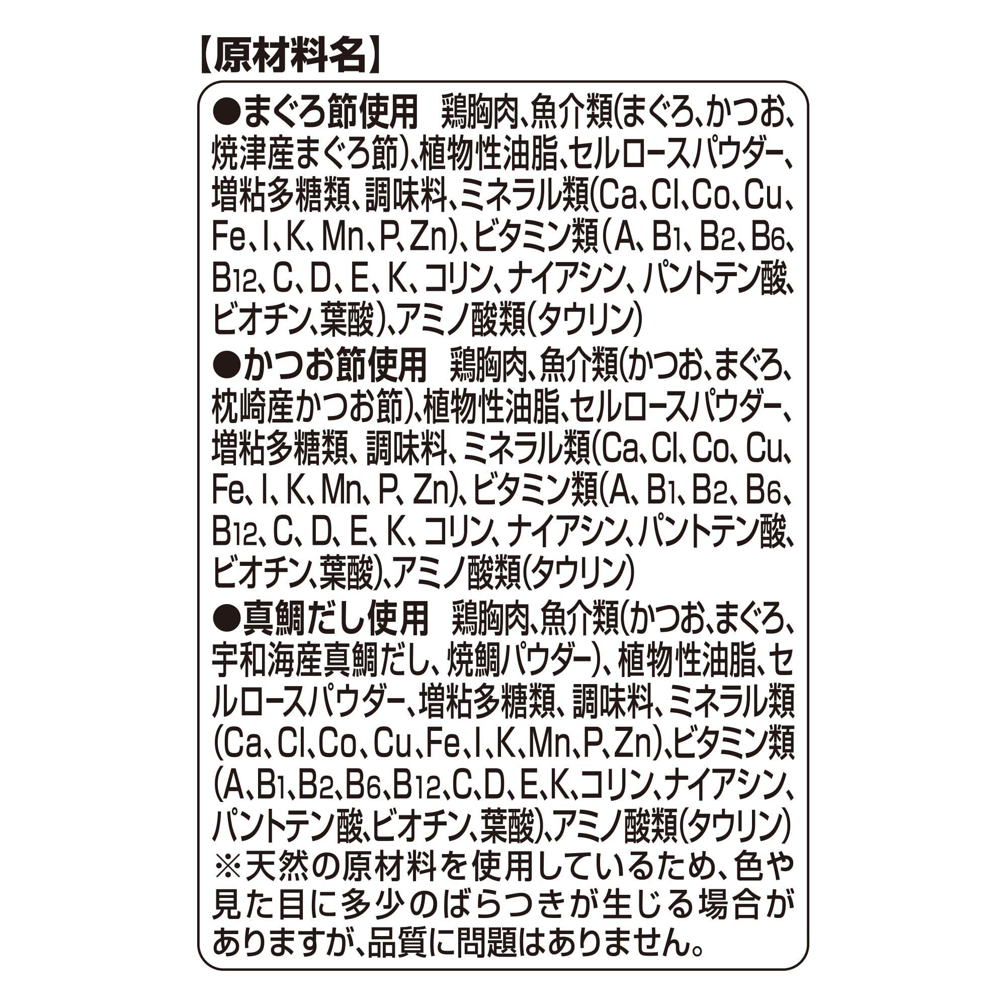 【原材料】●まぐろ節使用:鶏胸肉、魚介類(まぐろ、かつお、焼津産まぐろ節)、植物性油脂、セルロースパウダー、増粘多糖類、調味料、ミネラル類(Ca、Cl、Co、Cu、Fe、I、K、Mn、P、Zn)、ビタミン類(A、B1、B2、B6、B12、C、D、E、K、コリン、ナイアシン、パントテン酸、ビオチン、葉酸)、アミノ酸(タウリン)●かつお節使用:鶏胸肉、魚介類(かつお、まぐろ、枕崎産かつお節)、植物性油脂、セルロースパウダー、増粘多糖類、調味料、ミネラル類(Ca、Cl、Co、Cu、Fe、l、K、Mn、P、Zn)、ビタミン類(A、B1、B2、B6、B12、C、D、E、K、コリン、ナイアシン、パントテン酸、ビオチン、葉酸)、アミノ酸(タウリン)●真鯛だし使用:鶏胸肉、魚介類(かつお、まぐろ、宇和海産真鯛だし、焼鯛パウダー)、植物性油脂、セルロースパウダー、増粘多糖類、調味料、ミネラル類(Ca、Cl、Co、Cu、Fe、l、K、Mn、P、Zn)、ビタミン類(A、B1、B2、B6、B12、C、D、E、K、コリン、ナイアシン、パントテン酸、ビオチン、葉酸)、アミノ酸(タウリン)※天然の原材料を使用しているため、色や見た目に多少のばらつきが生じる場合がありますが、品質に問題はありません。【保証成分】タンパク質:5.5%以上、脂質:1.5%以上、粗繊維:1.0%以下、粗灰分:3.0%以下、水分:94.0%以下【エネルギー】カロリー:約4kcal/1本あたり
