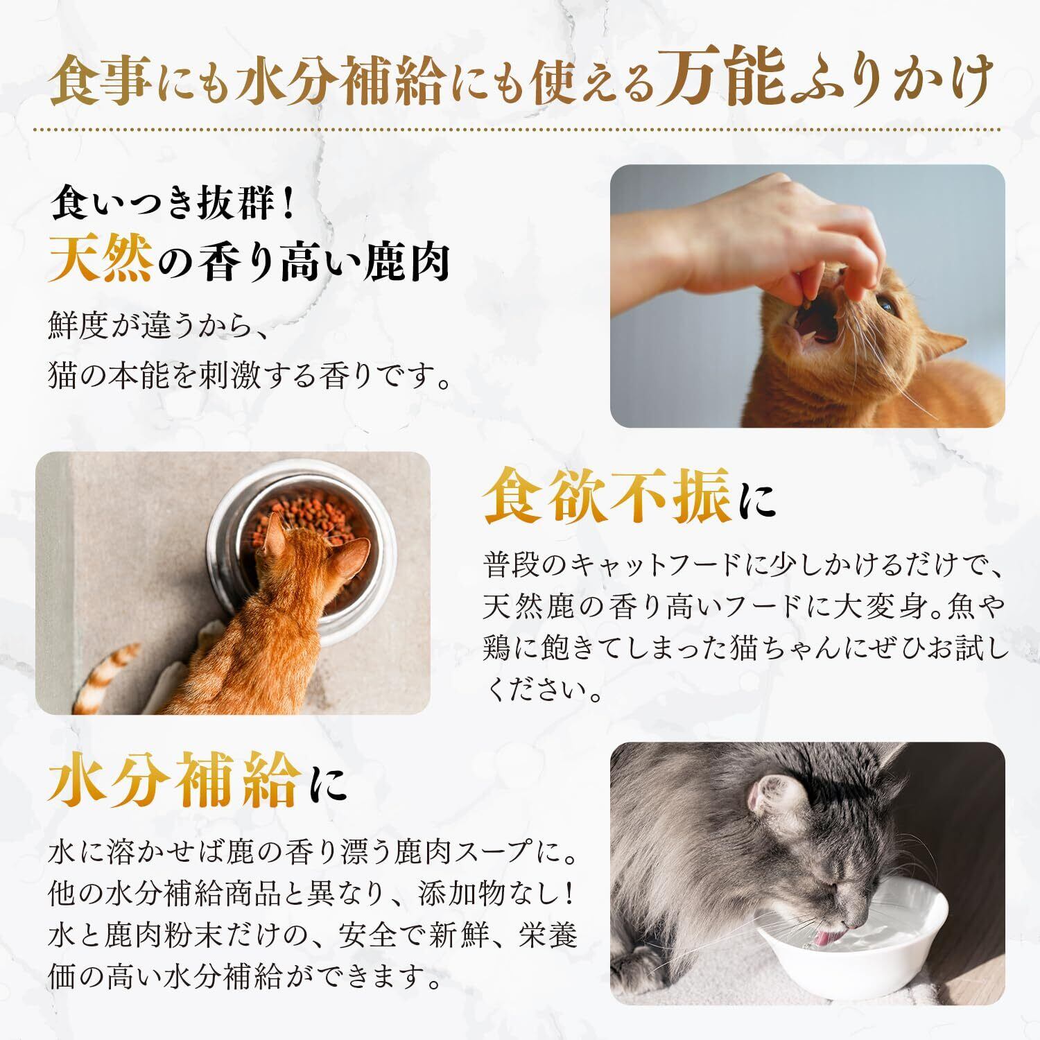 [水分補給にも]鹿肉の粉末なので、水に溶かせば香り高い鹿肉スープに。パウチ式の猫用水分補給商品と異なり、添加物などの心配もなく、新鮮な水を与えることができます。キャットフードにも飲み水にも使える、まさに万能ふりかけです。