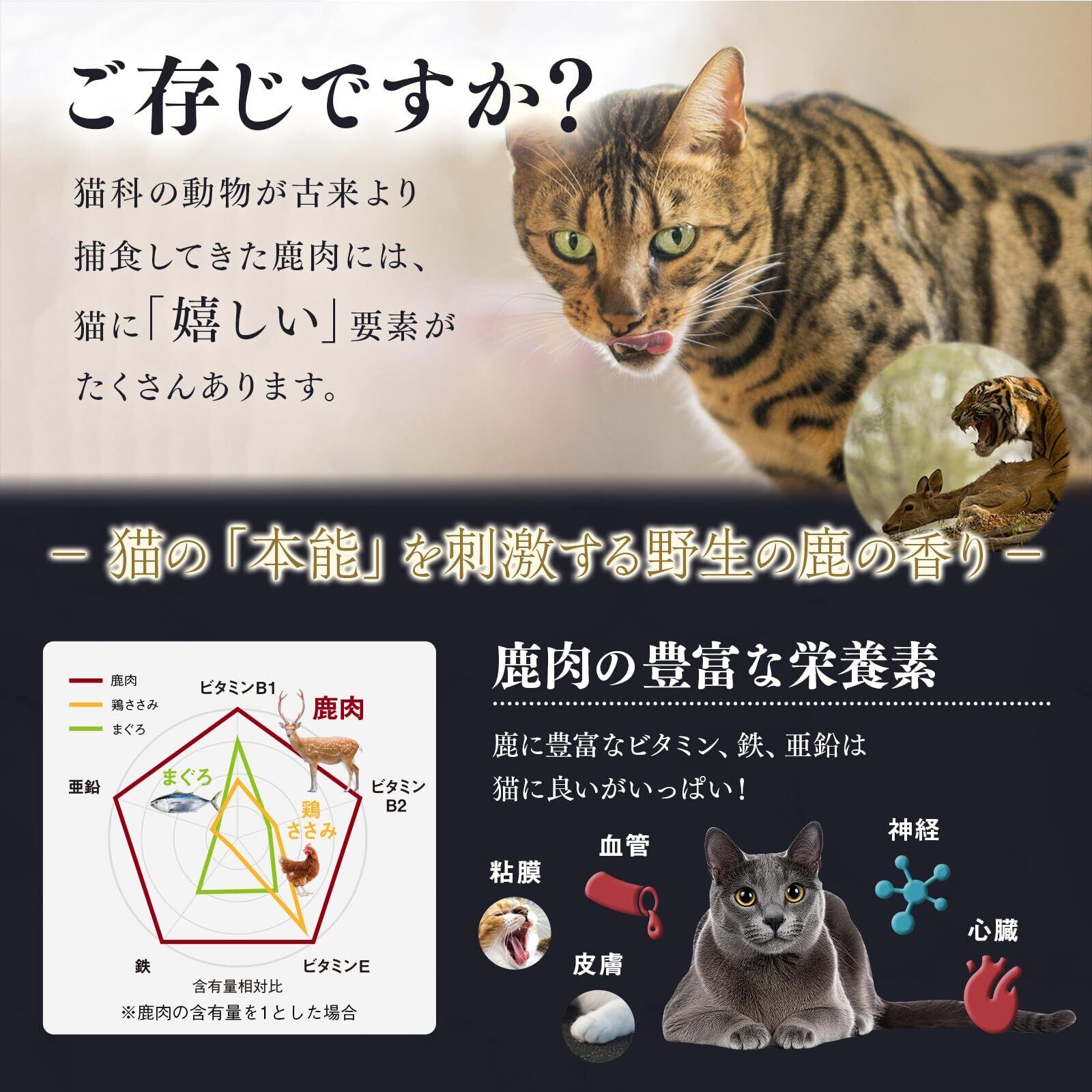 [美味しさの秘密は自然育ちの鹿を熟成加工]飼育された動物は抗生物質や合成抗菌剤を使った餌で育てられています。天然の鹿は添加物とは無縁の自然そのものを食べて育っているので、猫ちゃんにも安心です。捕獲後2時間以内に加工するので鮮度が違います。鮮度の高い鹿肉を贅沢に使ったふりかけは、香りが高く、猫ちゃんの食欲をそそります。