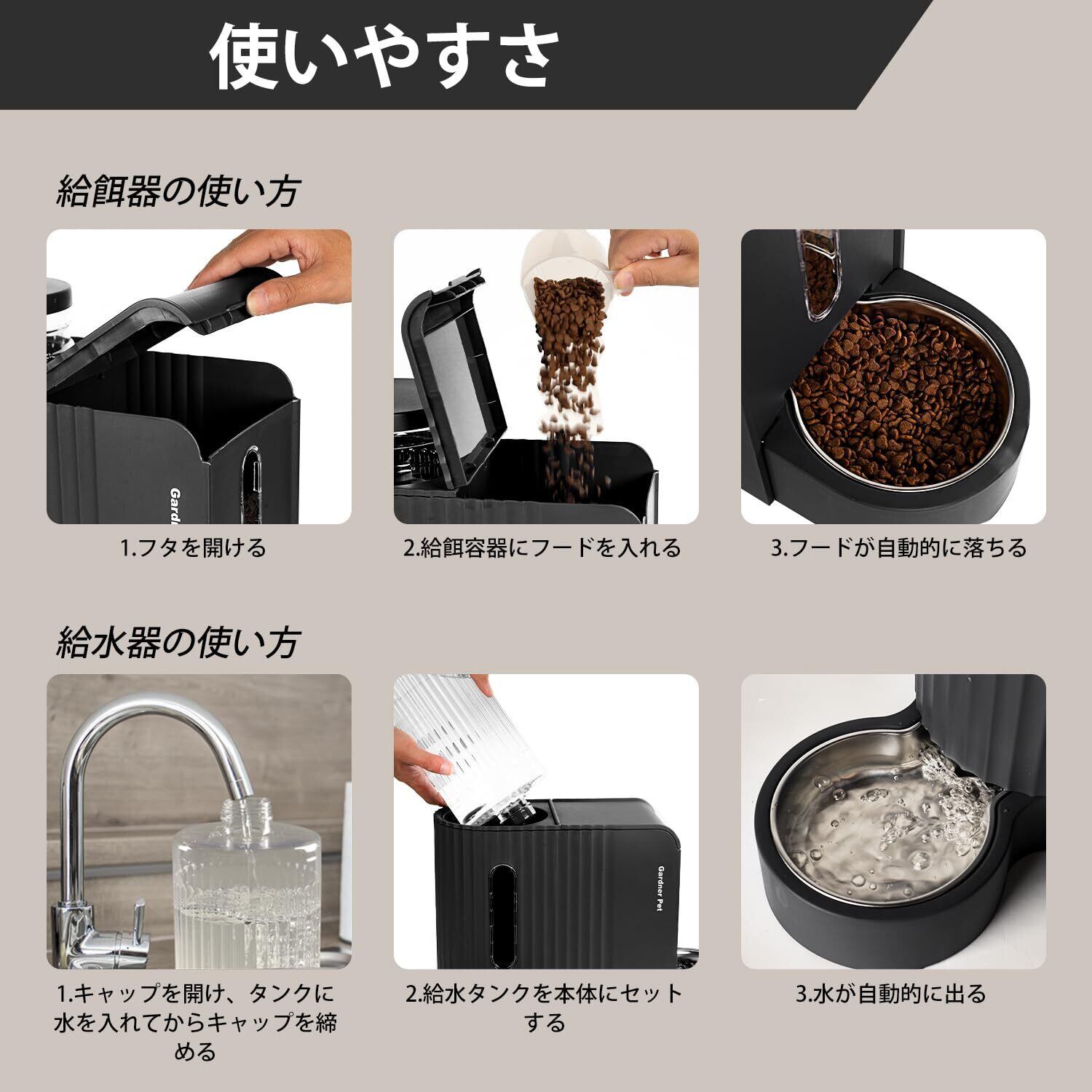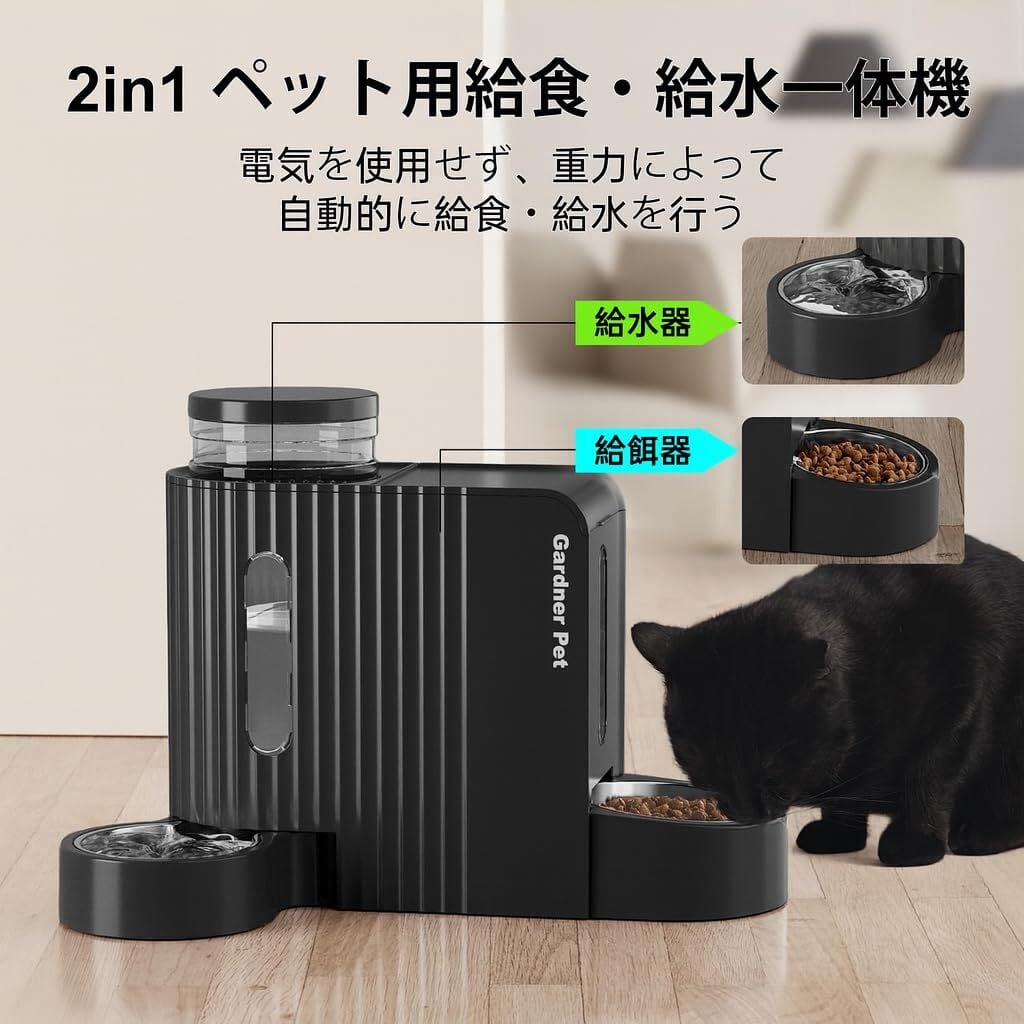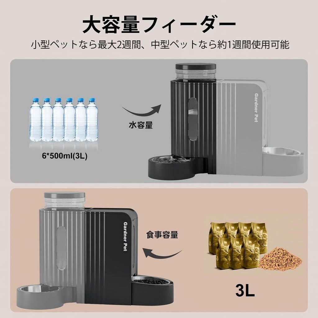 Gardner Pet 6L 大容量 ステンレスx2 無電重力式 自動給餌器 猫 犬【給餌器3L+給水器3L】一体型 おしゃれデザイン 重力式 自動餌やり機 ステンレス製ボウル 取り外し可能 丸洗い可能 犬猫兼用 留守番 無電心配なく丈夫 2週維持 モダンデザイン 自由設置 ボウルは180°回転可能 無電でも先端設計 加え機械美を追求したデザイン(ブラック)
