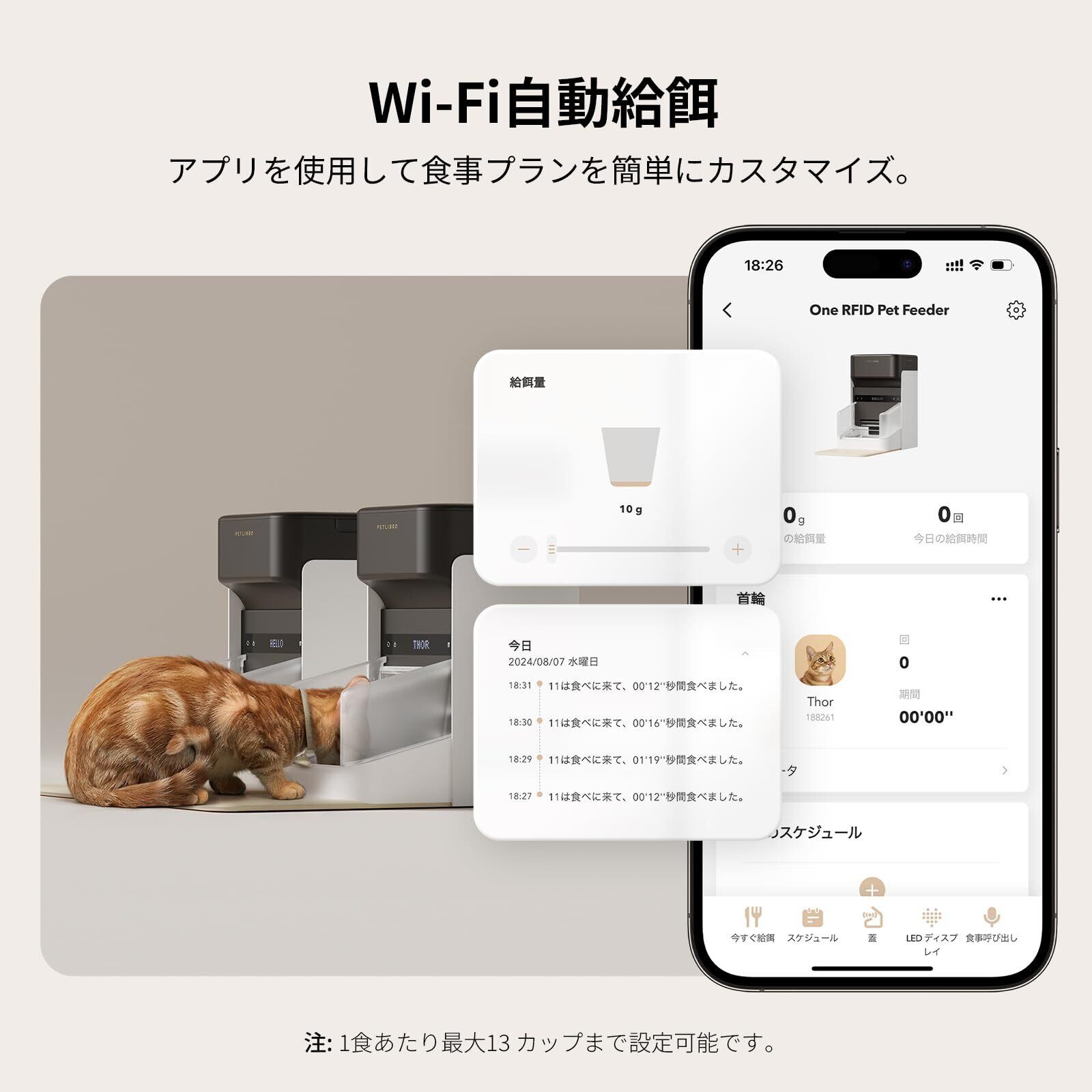 【よりスマートな給餌方式】PETLIBROアプリを使用すると、複数の給餌スケジュールを都合に合わせて作成および変更でき、ペットの食事時間に一貫性とバランスをもたらします。手動給餌オプションを使用すると、いつでもかわいがるネコちゃんに餌を追加できます。首輪タグセンサー付きのPETLIBRO RFIDスマート給餌器は、猫1匹あたり約二週間使用できますが、実際の期間は消費量によって異なる場合があります。