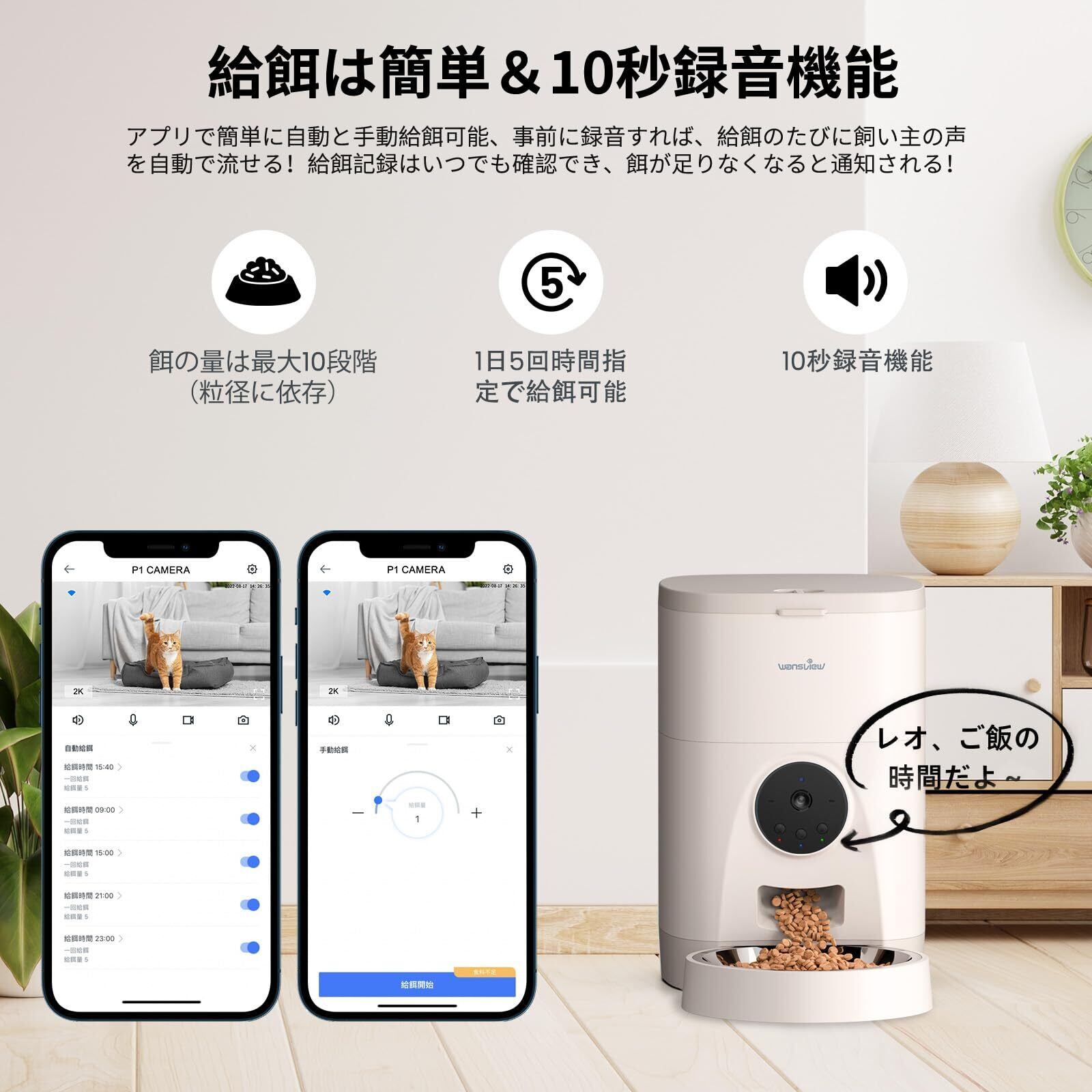 【大容量・自動給餌】ほとんどのドライフードタイプのキャットフードやドッグフードに対応できる4L大容量。スマホでWansview Cloudアプリを使用して、1日1-5回の自動給餌が可能。毎回1-10のポーションを設定でき、手動給餌もできる。ペットの食事量や食事時間を手軽に調整でき、アプリで給餌記録がメモされる。フード残量が不足してきたら、アプリでお知らせ。忙しい毎日でもペットの食事管理ができる。(※本製品は2.4GHz帯Wi-Fiのみ対応)