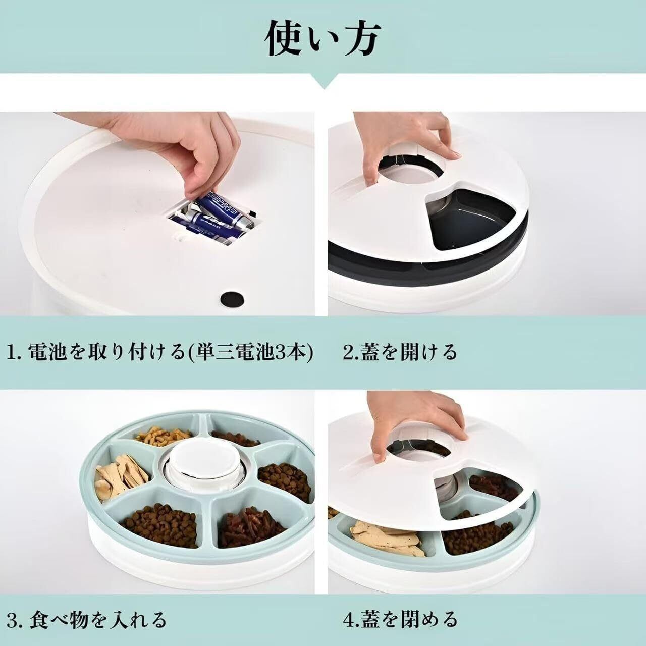 24 時間調整可能なタイマー: 1 日に最大 6 回の給餌時間をプログラムして、時間通りに食事を与えることができます。