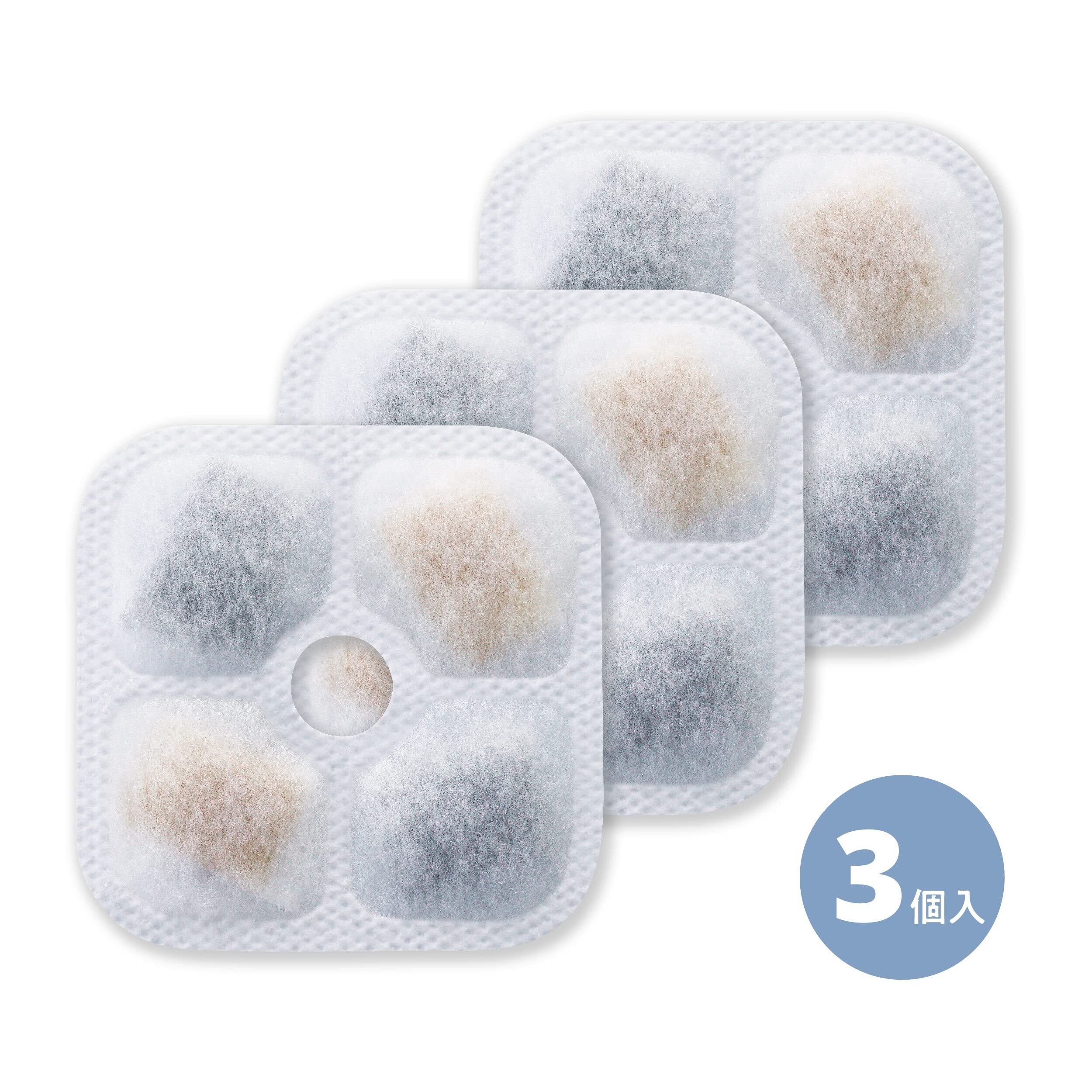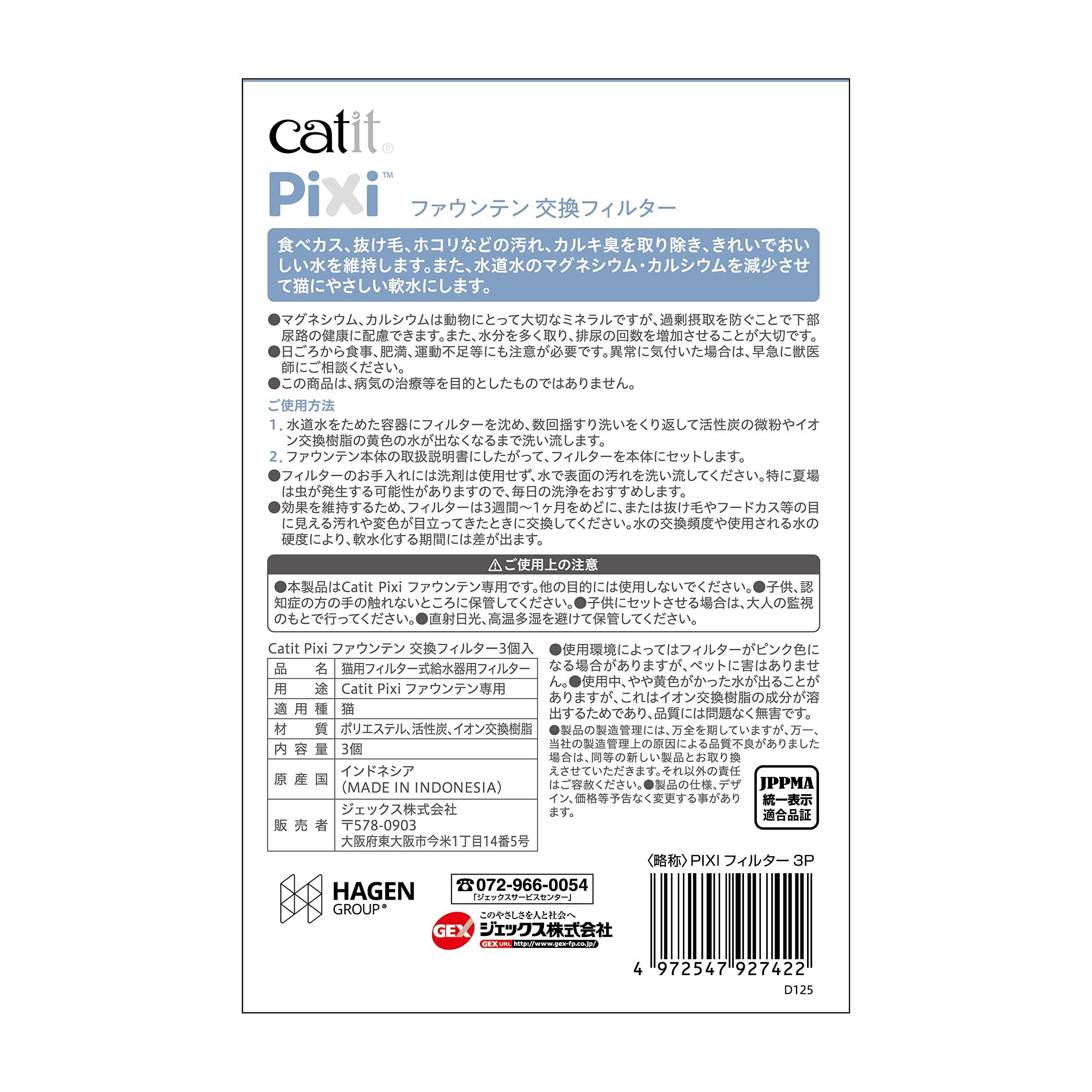 3つの機能で水をキレイにするCatit Pixiファウンテン専用交換フィルター。食べカス、抜け毛、ホコリなどの汚れ、カルキ臭を取り除き、きれいでおいしい水を維持します。水道水のマグネシウム・カルシウムを減少させて猫にやさしい軟水にします。 ●マグネシウム、カルシウムは動物にとって大切なミネラルですが、過剰摂取を防ぐことで下部尿路の健康に配慮できます。また、水分を多く取り、排尿の回数を増加させることが大切です。●日頃から食事、肥満、運動不足等にも注意が必要です。異常に気付いた場合は、早急に獣医師にご相談ください。●この商品は、病気の治療等を目的にしたものではありません。 内容量:3個
