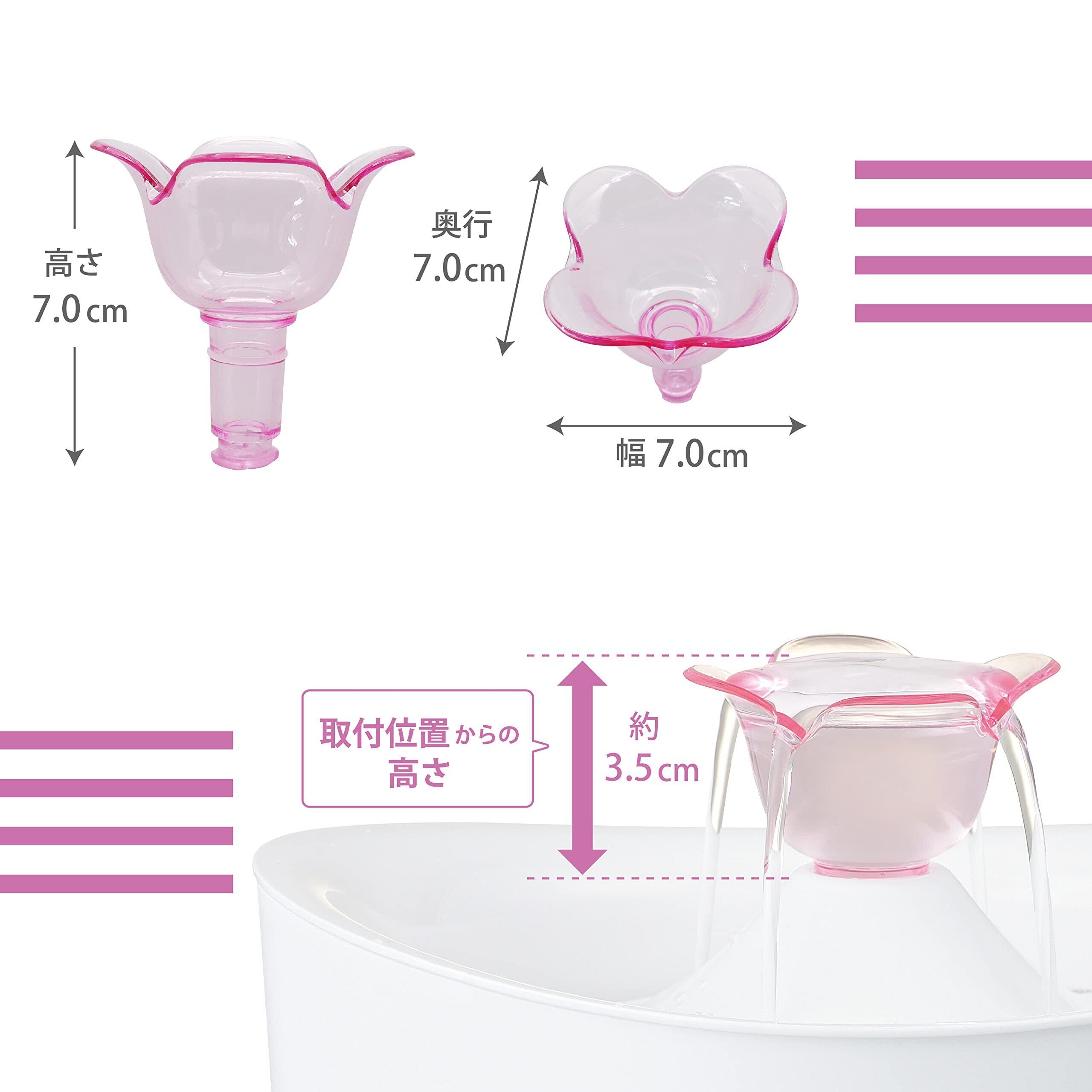 ピュアクリスタルに取り付けて、いろいろな水流にネコちゃんの好みに合わせて選べるピュアクリスタル プラスシリーズ!水流チェンジでネコちゃんハッピー!たまる+落ちるお水が好きなネコちゃんに!お花にたまった水がこぼれ落ちます。適合機種:ピュアクリスタル 1.5L/2.5L猫用、ニャーロピュアクリスタルに付けるだけ!ファンネルの穴に置くまで差し込むだけの簡単設置!●本体サイズ:約幅7.0×奥行7.0×高さ7.0cm●適用種:猫●材質:PS