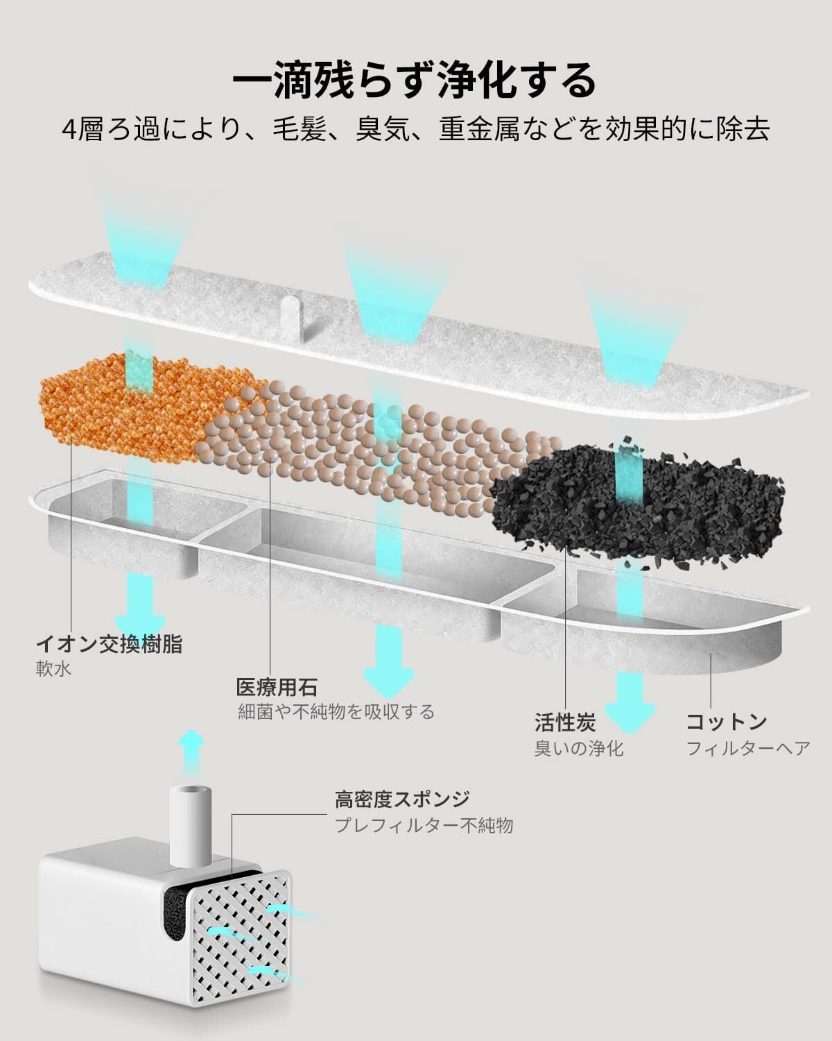 ペットの健康のために - 水の一滴一滴が多層フィルターを通過してすべての不純物を取り除き、酸素を豊富に含み、味の良い水を提供します。