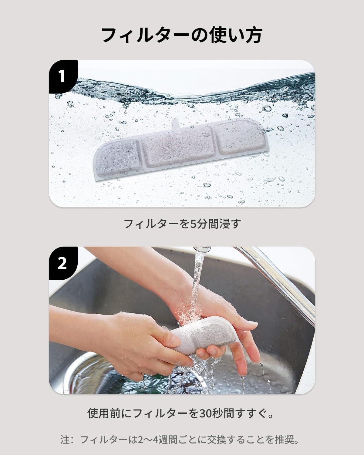 最適な使用のために - 使用前にフィルターを5分間浸し、30秒間すすぎます。フィルタリング効果を維持するために、フィルターは2週間ごとに交換することを推奨します。複数のペットがいる場合は、噴水をこまめに清掃し、フィルターをより頻繁に交換することを推奨します。