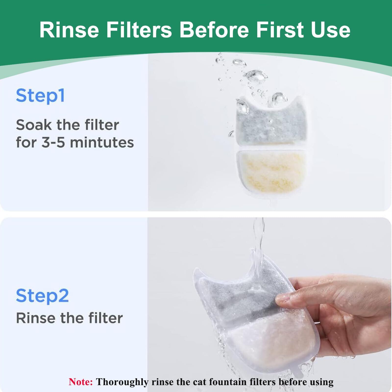 使用方法: 使用前に必要としてフィルターを水で3〜5分間洗い流して、炭の粉やほこりを取り除きます。フィルターの不織布側を上に向けて、フィルターの凸面側を対応するスロットに合わせて、給水器にセットして完了です。1〜2週間ごとにフィルターを交換することをお勧めします。※ご使用の状況によって交換目安期間は変わります。