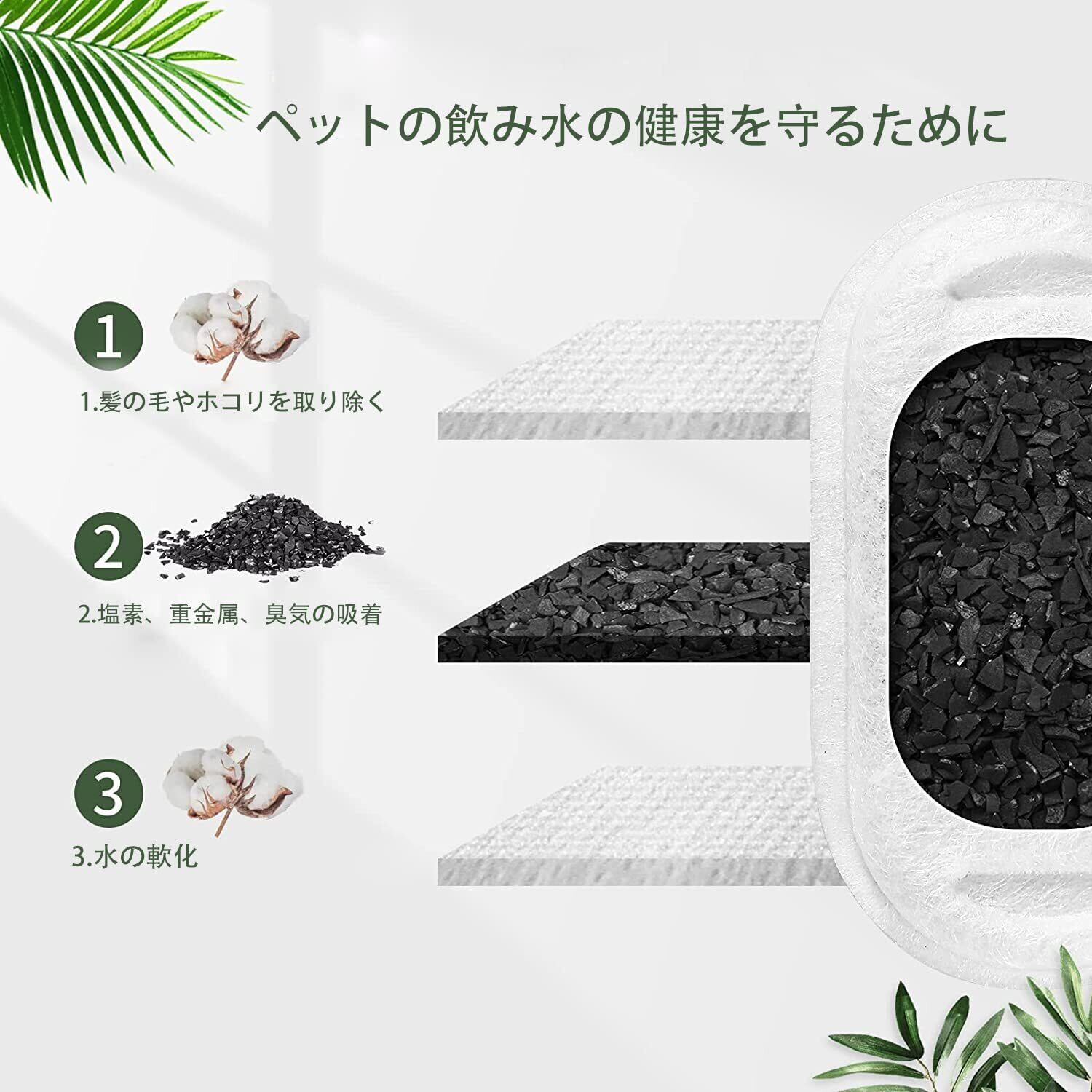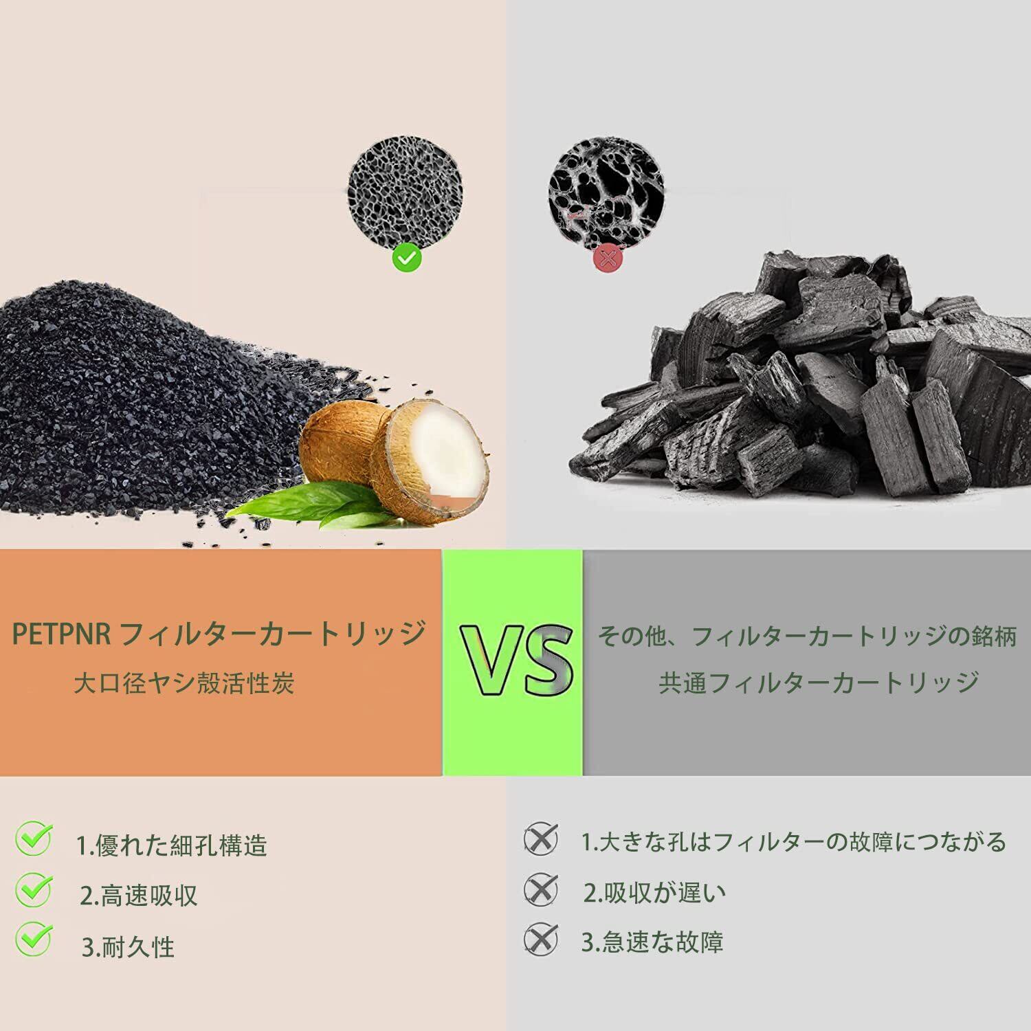 【ペットの健康を守る】フィルターカートリッジには、高品質のヤシ殻活性炭を使用しています。均一な孔、高速吸収、耐久性。重金属や塩素をろ過します。ペットに常に新鮮な水を供給することができるようになります。