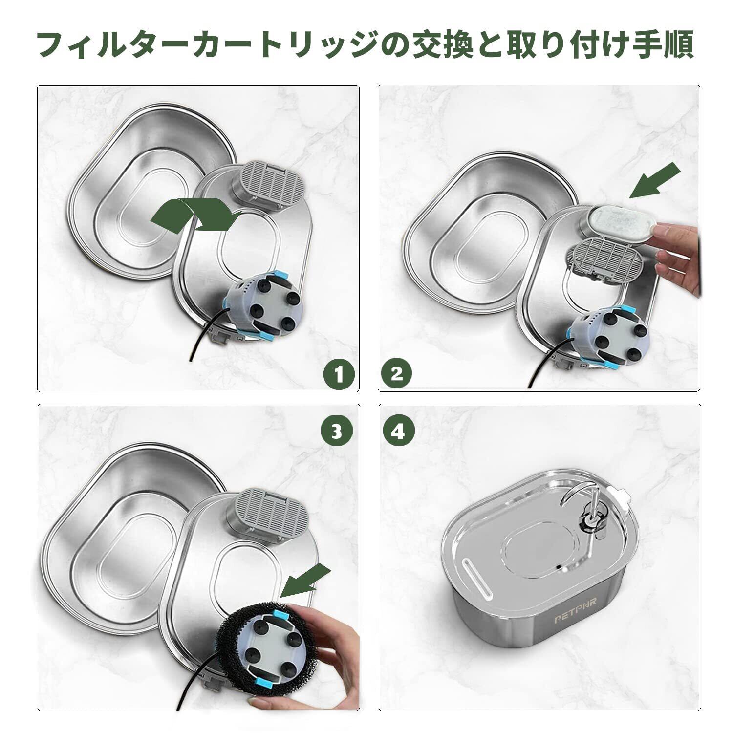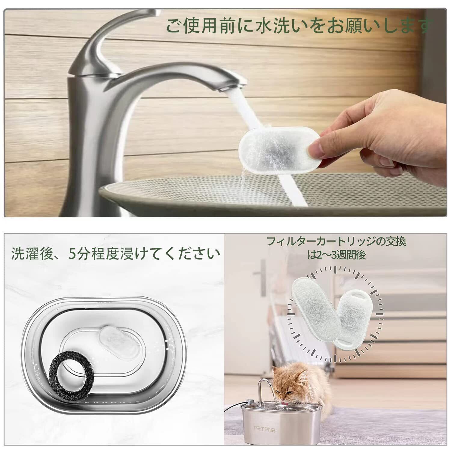 【使用上の注意】5分ほど浸してからご使用ください。フィルタースポンジの清掃は1週間に1回、フィルターカートリッジの交換は3~4週間に1回。交換の頻度はペットの数と飲水の回数によって異なりますので、実際の状況に合わせて調整してください。