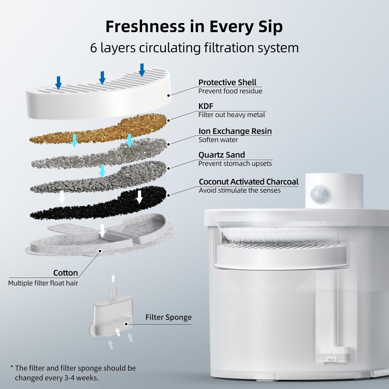 6層浄水ろ過 抑菌保護シェル、KDF 55、イオン交換樹脂、石英砂、天然ヤシ殻活性炭、PP綿を採用するフィルターです。水中の毛やほこり、食べかす、臭い、重金属などを除去し、水質を軟化させ、細菌の繁殖を抑制。常にペットに新鮮な水を提供し、猫の水飲みを促進でき、結石、下部尿路のリスクを軽減されます。