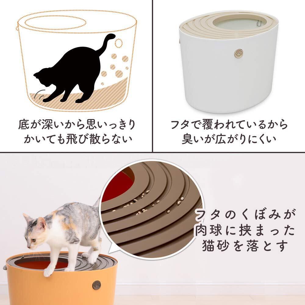 縦型デザインと飛び散り防止凹凸ふたで猫砂の飛び散りを解決する上から猫トイレです。猫の足に付着した砂が落ちやすように、ふたの溝で猫砂をキャッチして飛び散りを防ぎます。上ふた付きで臭いがもれにくいトイレです。お掃除しやすいスコップと、収納に便利なスコップフックが付いています。 使用方法 縦型デザインと飛び散り防止凹凸ふたで猫砂の飛び散りを解決する上から猫トイレです。猫の足に付着した砂が落ちやすように、ふたの溝で猫砂をキャッチして飛び散りを防ぎます。上ふた付きで臭いがもれにくいトイレです。お掃除しやすいスコップと、収納に便利なスコップフックが付いています。