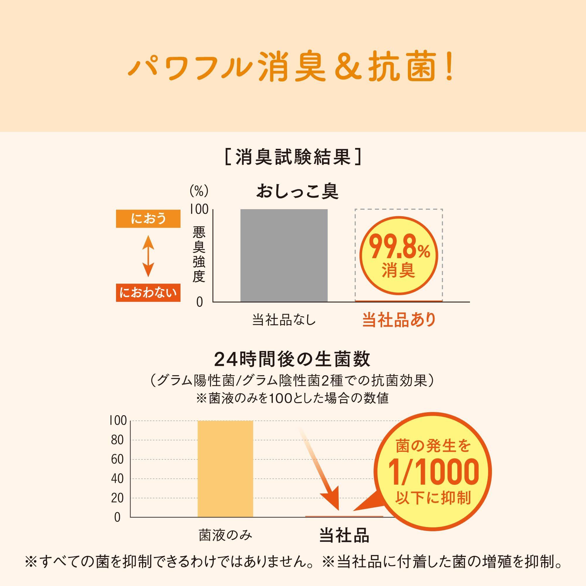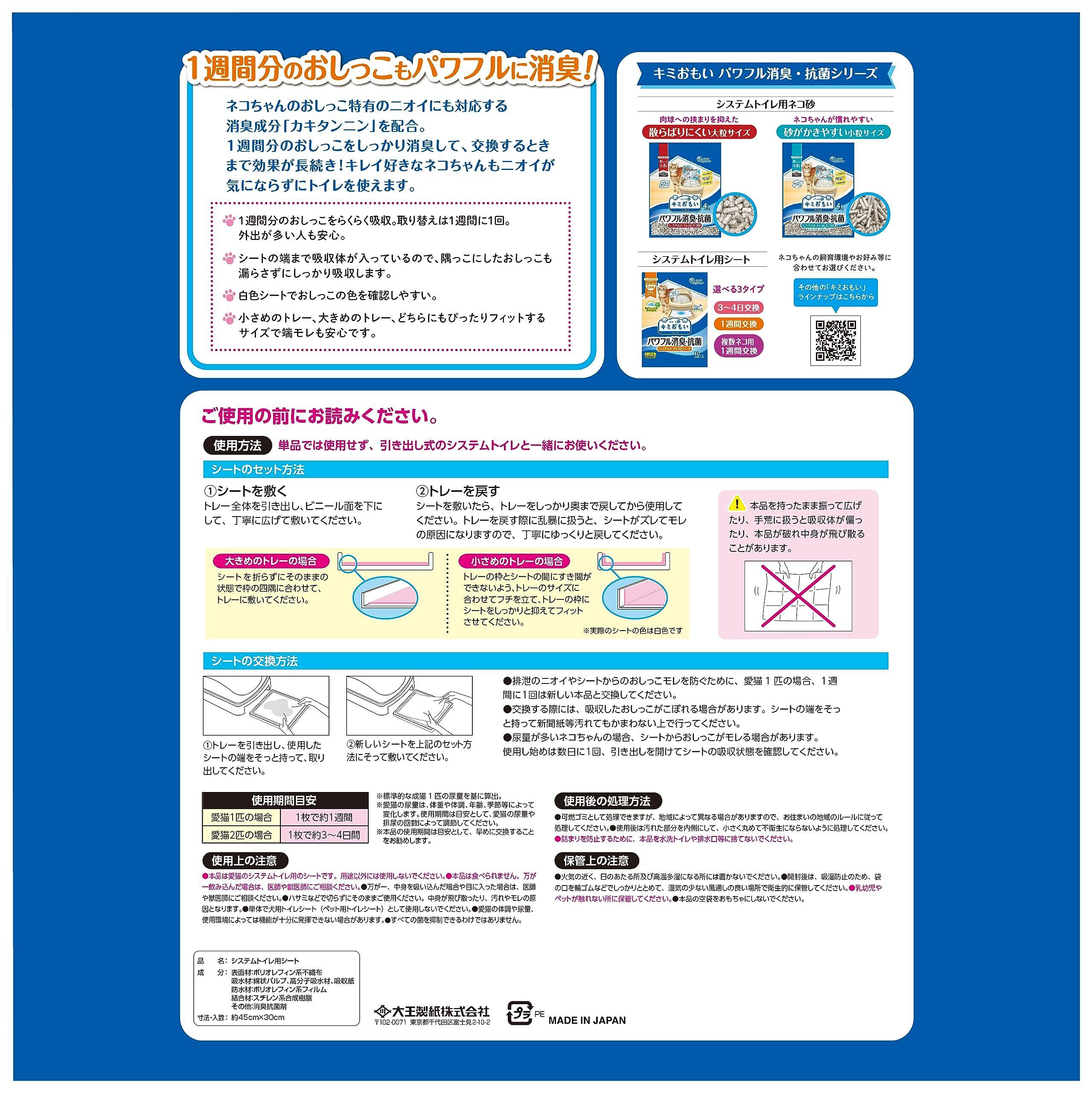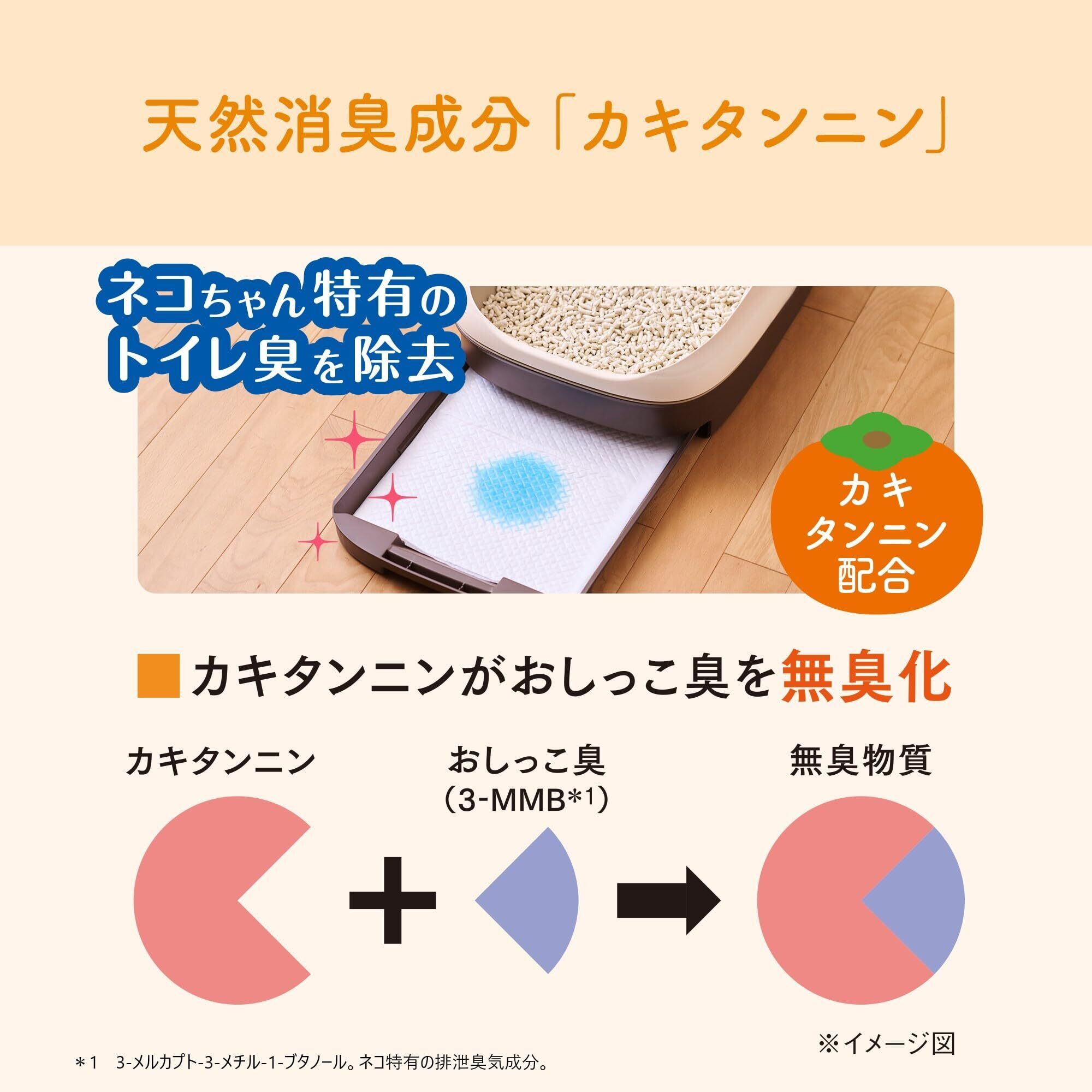 ●消臭成分「カキタンニン」配合でネコちゃん特有のトイレ臭を除去。ネコちゃんのおしっこ特有のニオイの原因と消臭成分「カキタンニン」が結合しネコちゃんのおしっこ臭を元から除去します。●菌の増殖を抑制し抗菌効果が続く。●端っこにおしっこをしてもしっかり吸収してもれにくいシート構造。防水シートが吸収体をくるむように巻いてあり横モレを防止。同じ場所で繰り返しおしっこしてもモレにくい。●どのメーカーのシステムトイレでもOKの各社共通サイズ。各社のどのシステムトイレにもぴったりフィットするサイズで横モレも安心。●1週間分の尿を吸収&パワフル消臭。