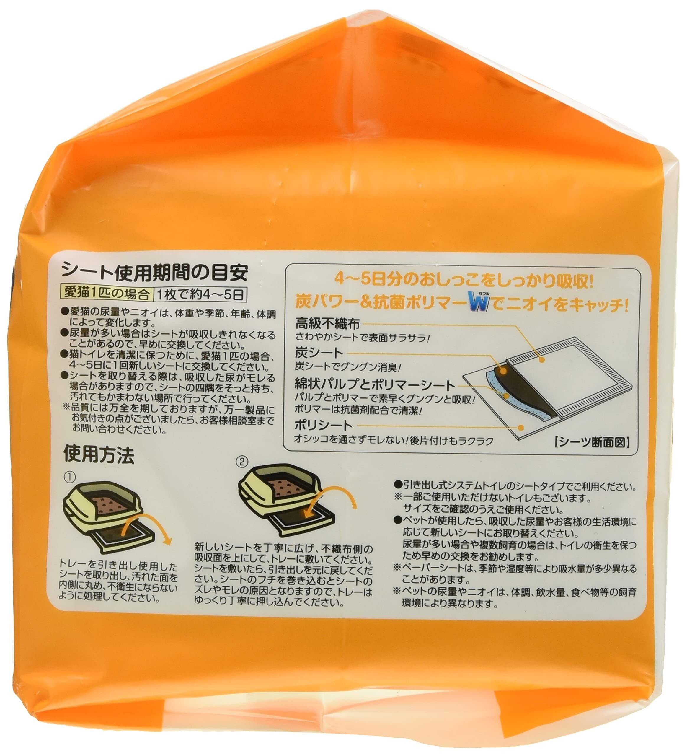 炭パワー&抗菌ポリマーWでニオイをキャッチするシステムトイレ用シート。1枚で4~5日分のおしっこをしっかり吸収でき、約3ヶ月取替え不要。【シートサイズ(外寸):29×44cm】