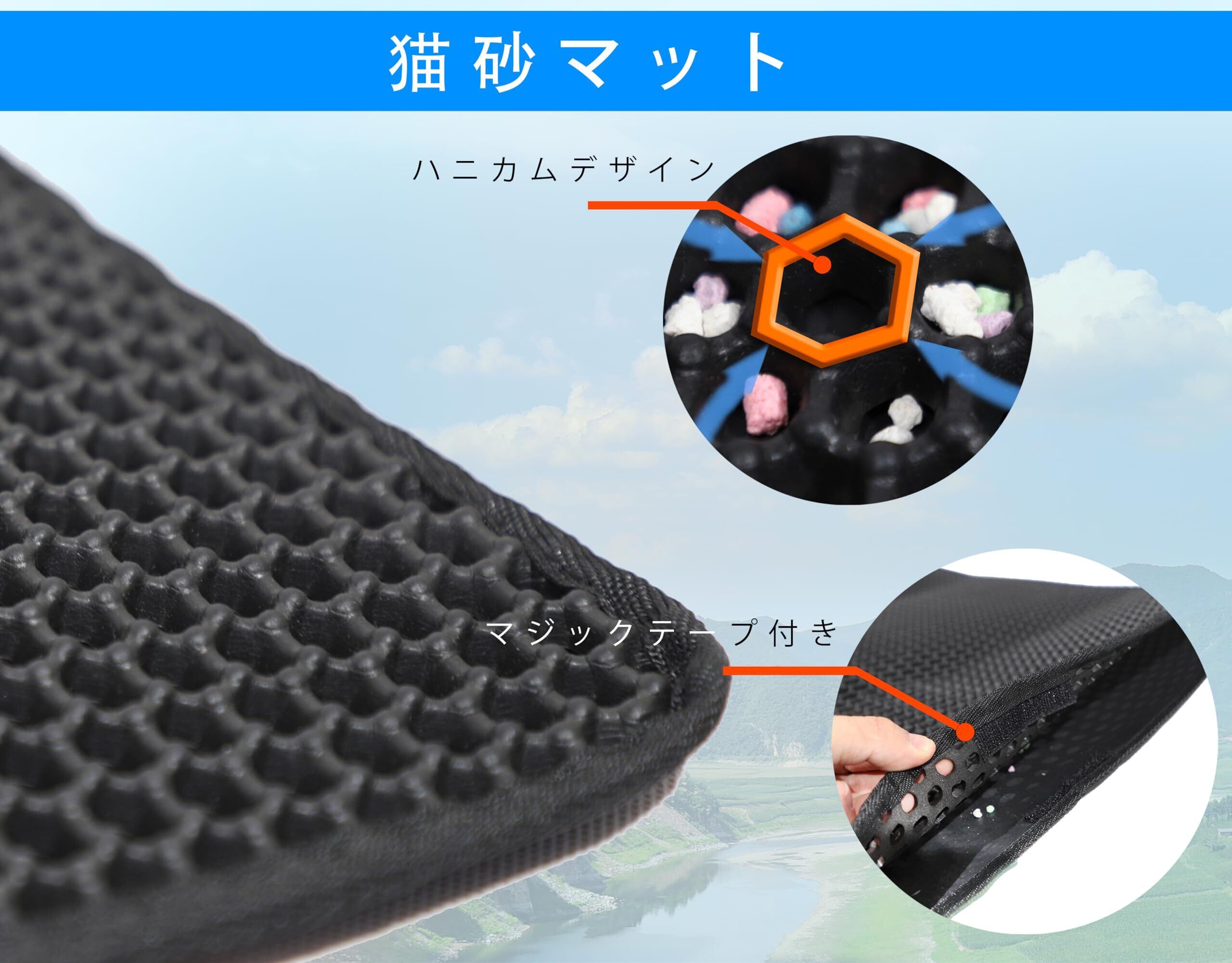 ① 猫砂飛び散り防止・清潔を維持 二層構造のハニカムデザインにより、猫がトイレから出る際に足についた猫砂をしっかりキャッチ。猫トイレマット / 猫砂マットとして猫砂の飛び散りを防止し、床や周囲を常に清潔に保ちます。