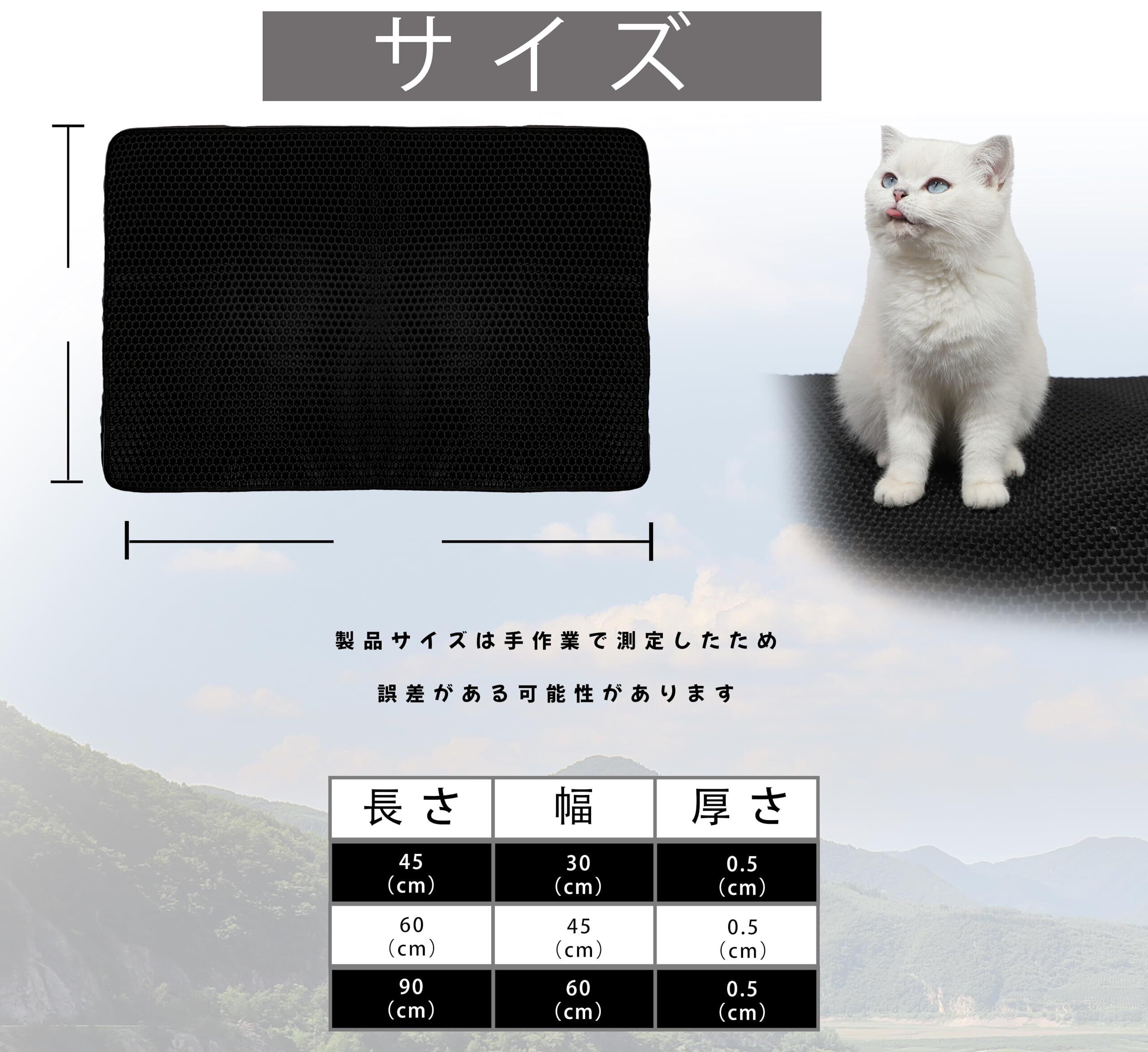 ⑤ 3サイズ展開で全猫種対応 S・M・Lの3サイズを提供し、子猫・成猫・大型猫まで幅広く対応。多頭飼いにもおすすめで、ケージ用マット、ペットマットとしても利用可能。インテリアになじむブラックカラーで、スタイリッシュに使用できます