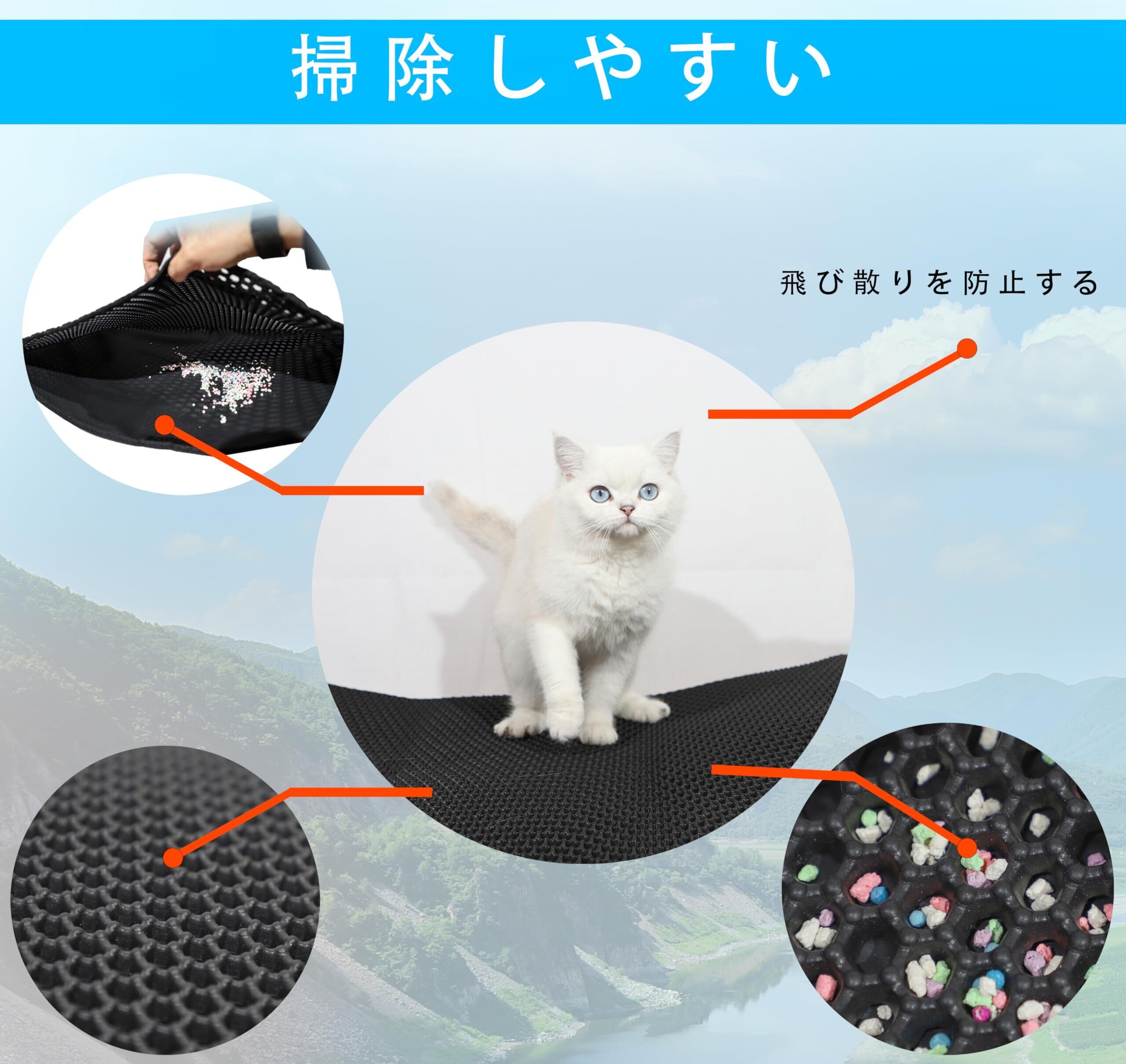 ② 滑り止め付きで安心設計 底面に滑り止め加工が施されており、使用中にマットがズレたり動いたりするのを防ぎます。猫がトイレを使用する際に安定感を与え、ペットの安全性を確保。フローリングや畳の上でも快適に使用可能です。