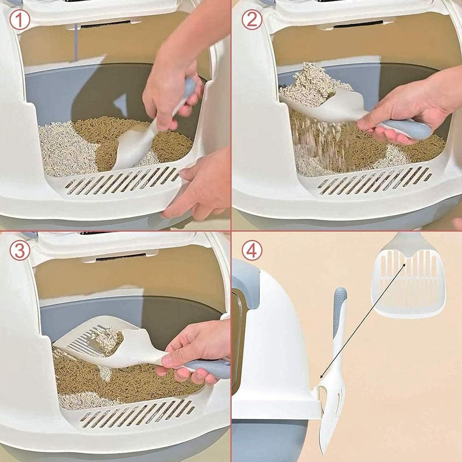 【単純な操作】猫用トイレトレーシャベルは深いシャベルふるいが付いており、猫用トイレの固形廃棄物を効果的に除去し、猫用トイレを清潔に保ちます。
