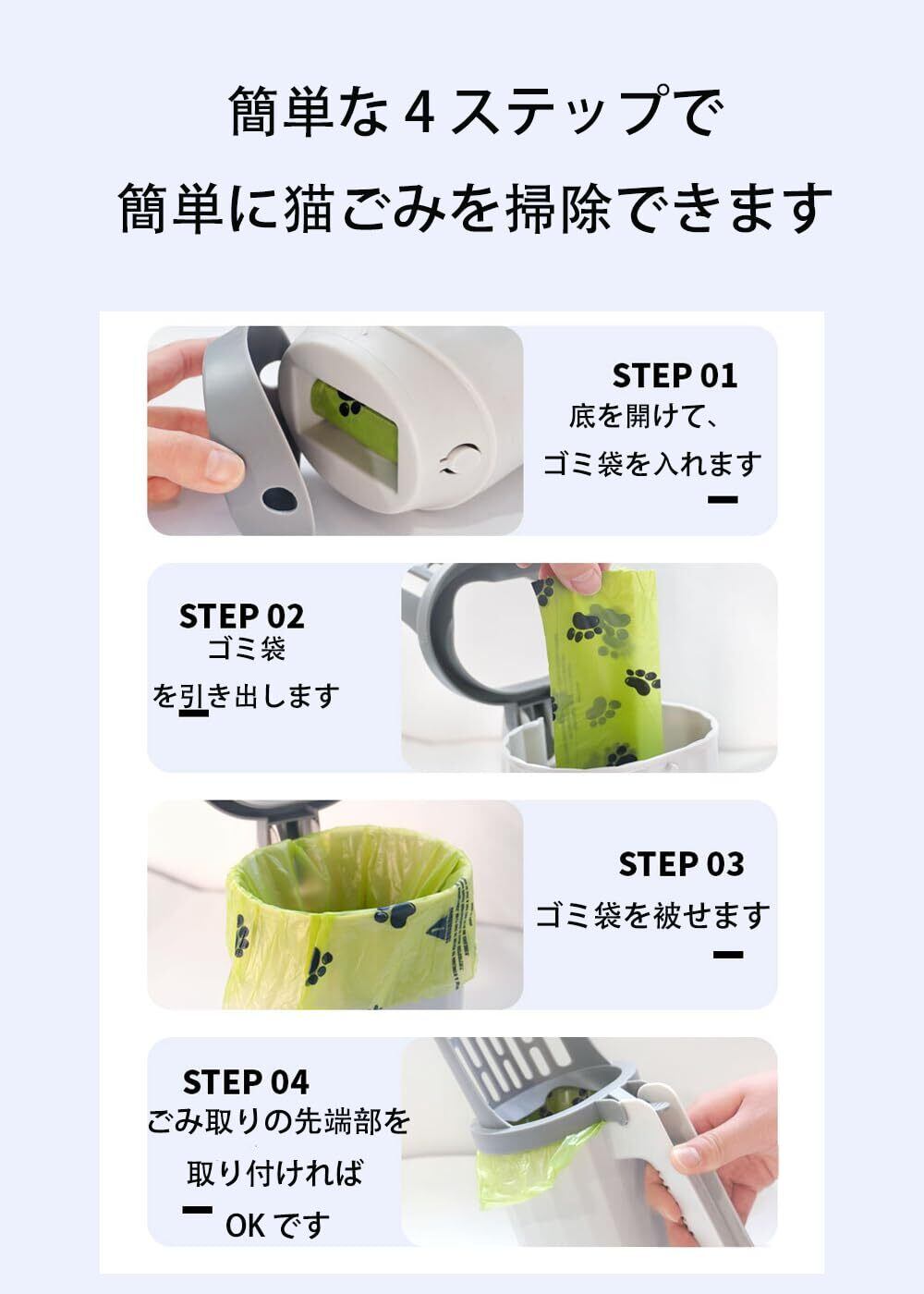 [ホルダー付き2 IN 1スコップ]猫砂スコップ+猫砂入れ+ゴミ袋の組み合わせユニークなデザインです。掃除と回収が一体となり、シンプルなスコップだけでなく、追加の袋も付いて、片手でペットのウンチを掃除でき、便利で毎日の掃除に適しています。 [バッグ&バッグディスペンサー]うんち袋を含み、これらの袋は良い香料で作られ、効果的に缶でゴミの臭いを減らすことができます。お客様のために、より多くの袋は、より良い使用経験、パッケージにはバッグディスペンサーが含まれており、ディスペンサーに予備のバッグを入れます。 [心地よいハンドル&ユニークな中空デザイン]人間工学に基づいたハンドルは、ごみ箱をすくう時に曲げたり、折ったり、揺らしたりすることを防ぎ、ごみ箱の中で手を汚さずに猫のウンチを素早くきれいにすることもできます。 [高品質の素材]スコップはPP材料で作られています。軽量で丈夫に使用できます。片手で操作でき、猫のウンチを瞬時にゴミ箱に回収し、扱いやすく、従来の掃除方法より優れています。 [アドバイス]当社のスコップは、子猫や子犬のいる家庭に適しています。1-2日おきにゴミ箱を掃除することをお勧めします。非常に大きな塊の場合は、スプーンの端を使って塊を半分に切ってからすくうとよいでしょう。また、犬の散歩の際に当社のディスペンサーとゴミ袋を持参すると、犬の糞の問題をよりよく解決することができます。[ホルダー付き2 IN 1スコップ]猫砂スコップ+猫砂入れ+ゴミ袋の組み合わせユニークなデザインです。掃除と回収が一体となり、シンプルなスコップだけでなく、追加の袋も付いて、片手でペットのウンチを掃除でき、便利で毎日の掃除に適しています。 [バッグ&バッグディスペンサー]うんち袋を含み、これらの袋は良い香料で作られ、効果的に缶でゴミの臭いを減らすことができます。お客様のために、より多くの袋は、より良い使用経験、パッケージにはバッグディスペンサーが含まれており、ディスペンサーに予備のバッグを入れます。 [心地よいハンドル&ユニークな中空デザイン]人間工学に基づいたハンドルは、ごみ箱をすくう時に曲げたり、折ったり、揺らしたりすることを防ぎ、ごみ箱の中で手を汚さずに猫のウンチを素早くきれいにすることもできます。 [高品質の素材]スコップはPP材料で作られています。軽量で丈夫に使用できます。片手で操作でき、猫のウンチを瞬時にゴミ箱に回収し、扱いやすく、従来の掃除方法より優れています。 [アドバイス]当社のスコップは、子猫や子犬のいる家庭に適しています。1-2日おきにゴミ箱を掃除することをお勧めします。非常に大きな塊の場合は、スプーンの端を使って塊を半分に切ってからすくうとよいでしょう。また、犬の散歩の際に当社のディスペンサーとゴミ袋を持参すると、犬の糞の問題をよりよく解決することができます。
