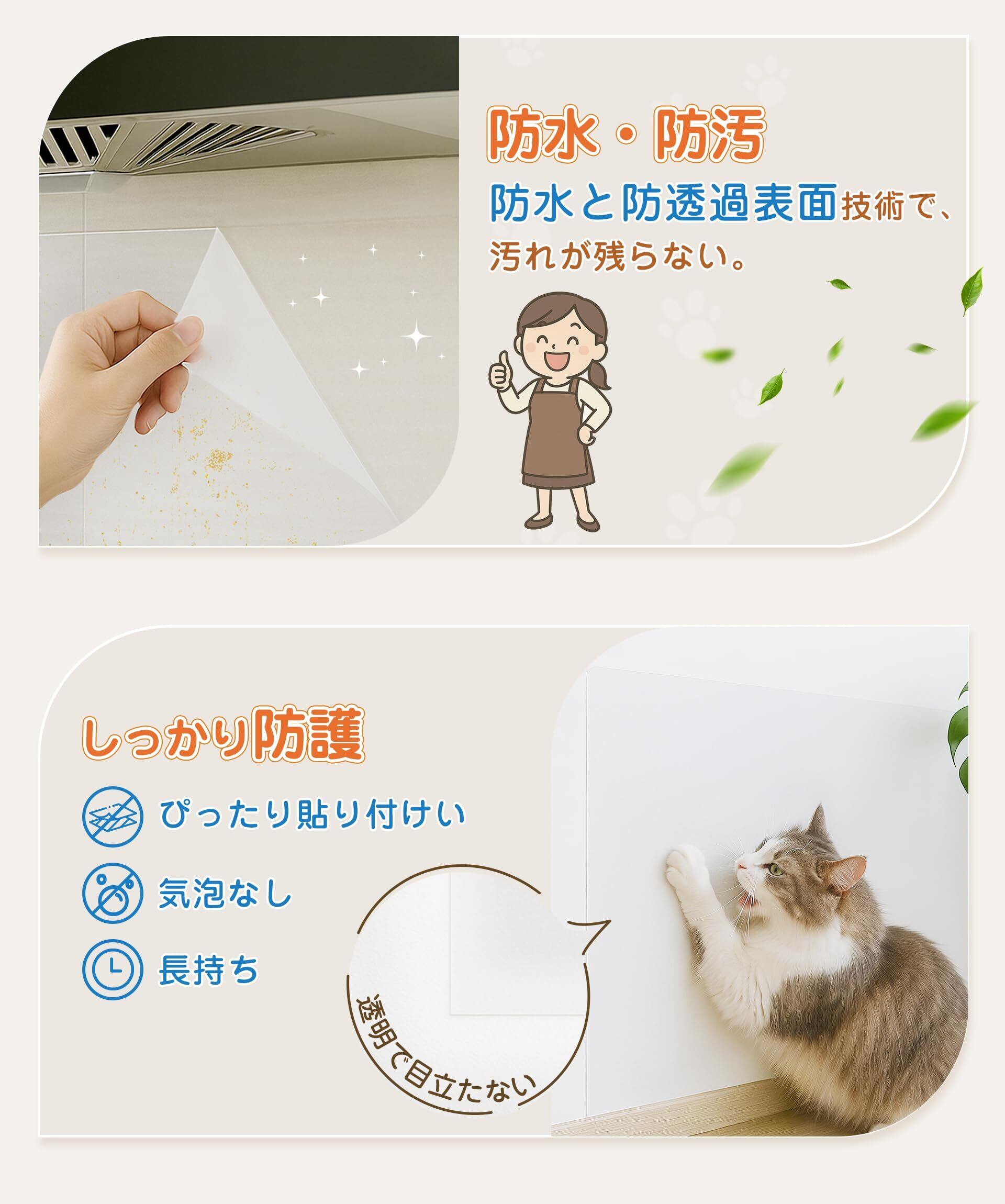 【強化素材・猫の爪に強い】厚みのある強化素材で作られた爪研ぎ防止シートは、耐久性があり破れにくい設計です。活発な猫が爪を研ぐ行動にも耐えるため、壁や家具を猫の爪から確実に保護します。