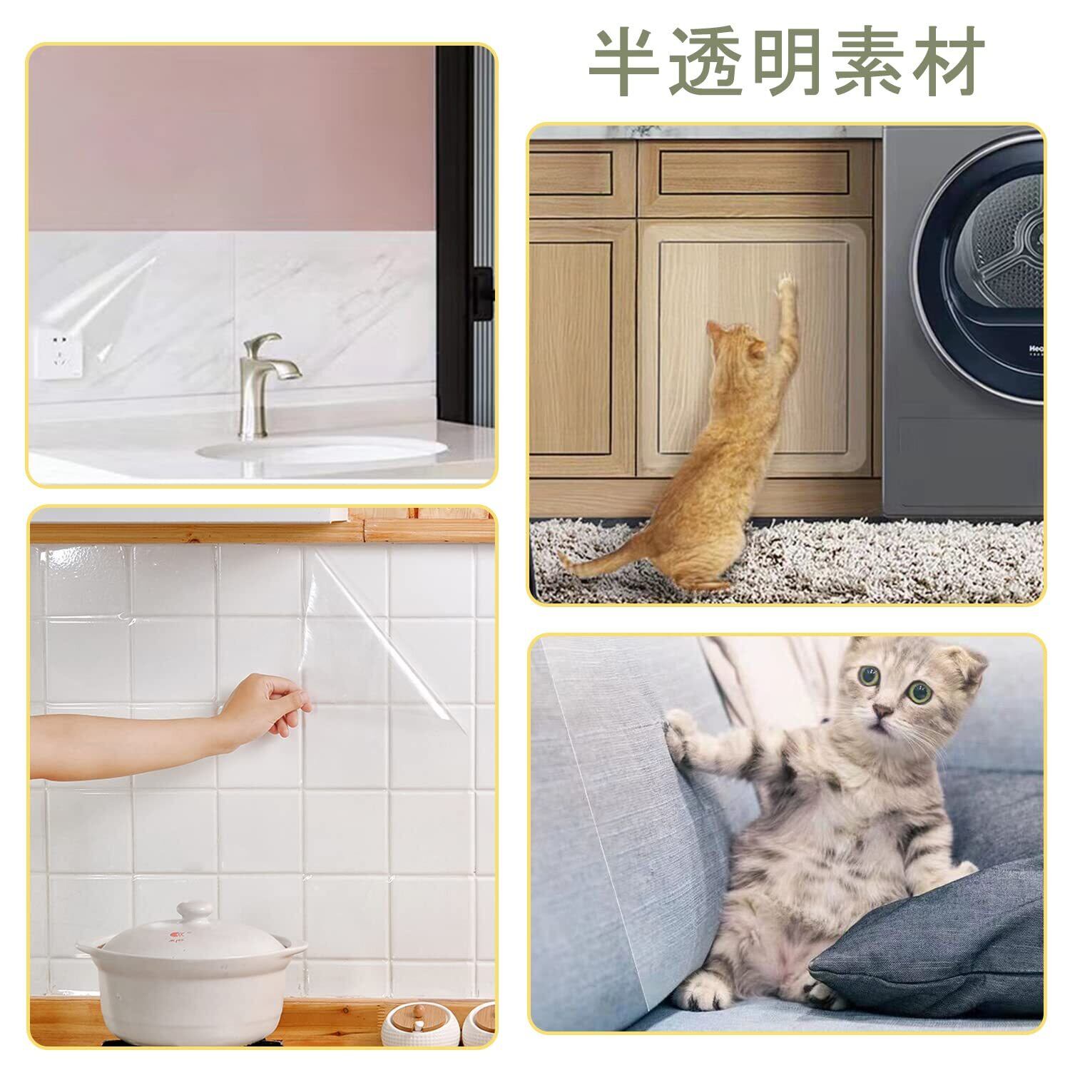 【壁紙、家具などを保護する】壁紙、家具などに貼ると、ひっかきや汚れなどではなく、子供の落書きや日常の汚れ、ペットさんの爪研ぎなど防止できます。大切な壁紙や家具を保護します。そして、防水防油なので、汚れたところにはすぐ綺麗にできます。ペット対策におすすめです。