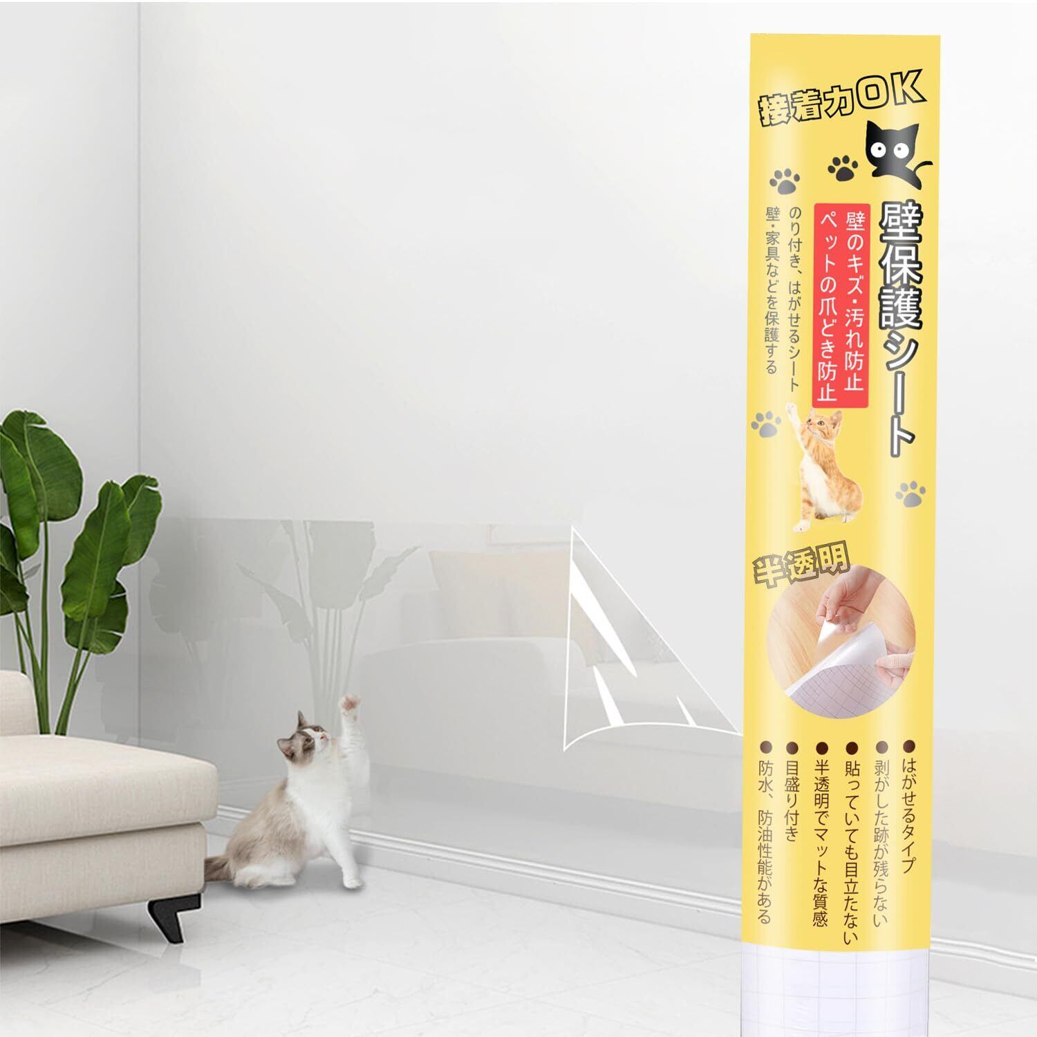 【新春セール】TACHIO 猫 壁紙 保護シート 爪とぎ防止シート 40cm×10m はがせる 壁紙シール 壁保護シート のり付き 半透明 ペット ひっかき 汚れ防止 落書き対策 賃貸OK 防水防油 猫用しつけ用品 | wakuwakuland
