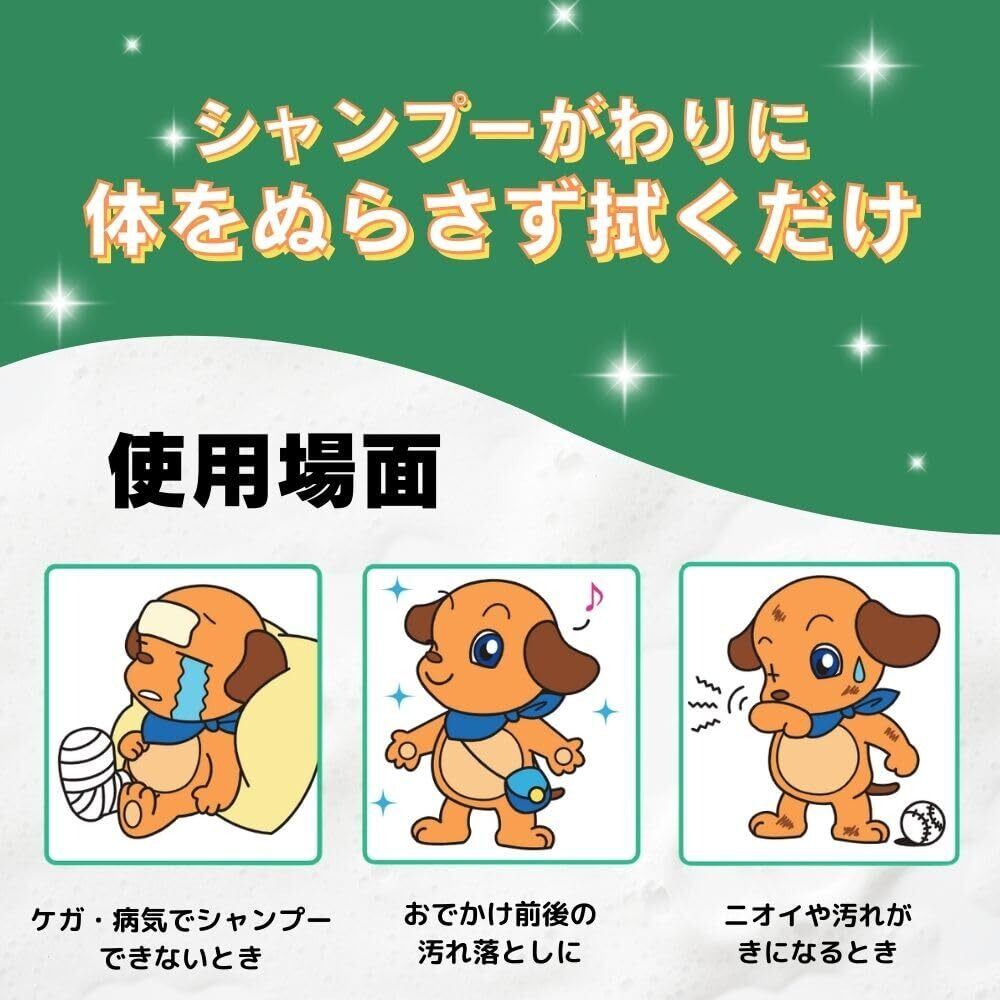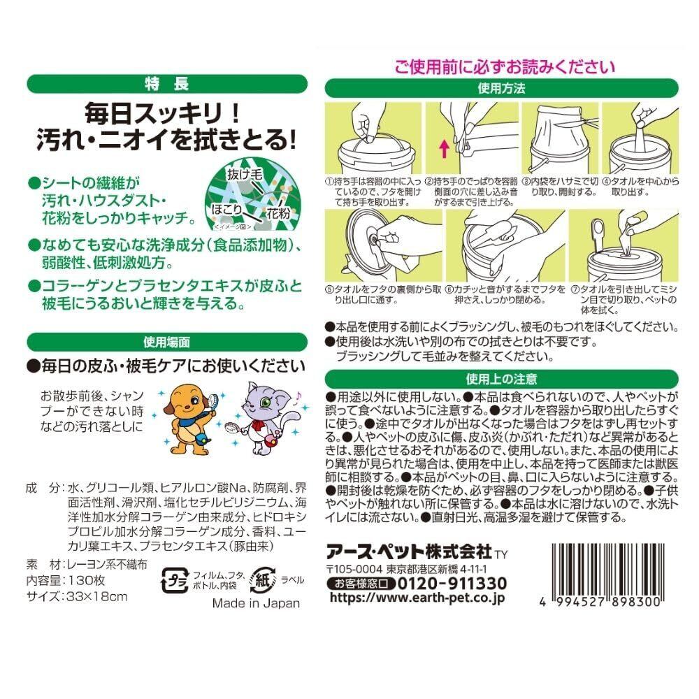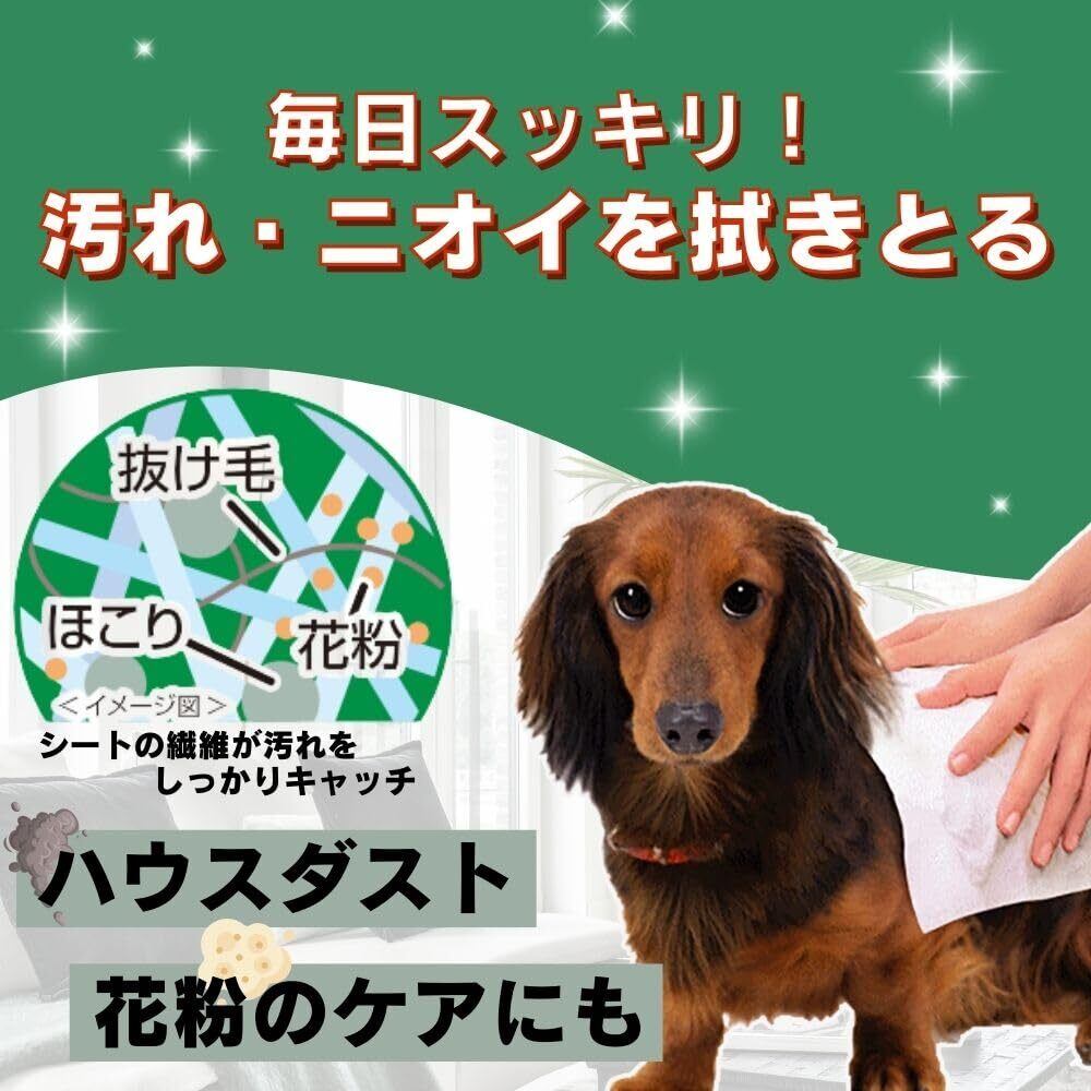 ・シートの繊維が汚れ・ハウスダスト・花粉をしっかりキャッチ。 ・なめても安心な洗浄成分(食品添加物)、弱酸性、低刺激処方。 ・コラーゲンとプラセンタエキスが皮ふと被毛にうるおいと輝きを与える。 ・ほのかなソープの香り。 <用途> 毎日の皮ふ・被毛ケアに。 お散歩前後、シャンプーができない時などの汚れ落としに。