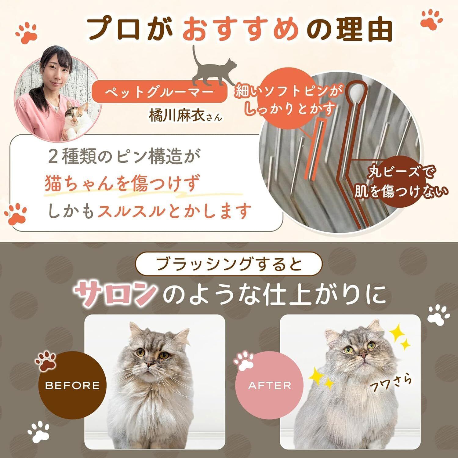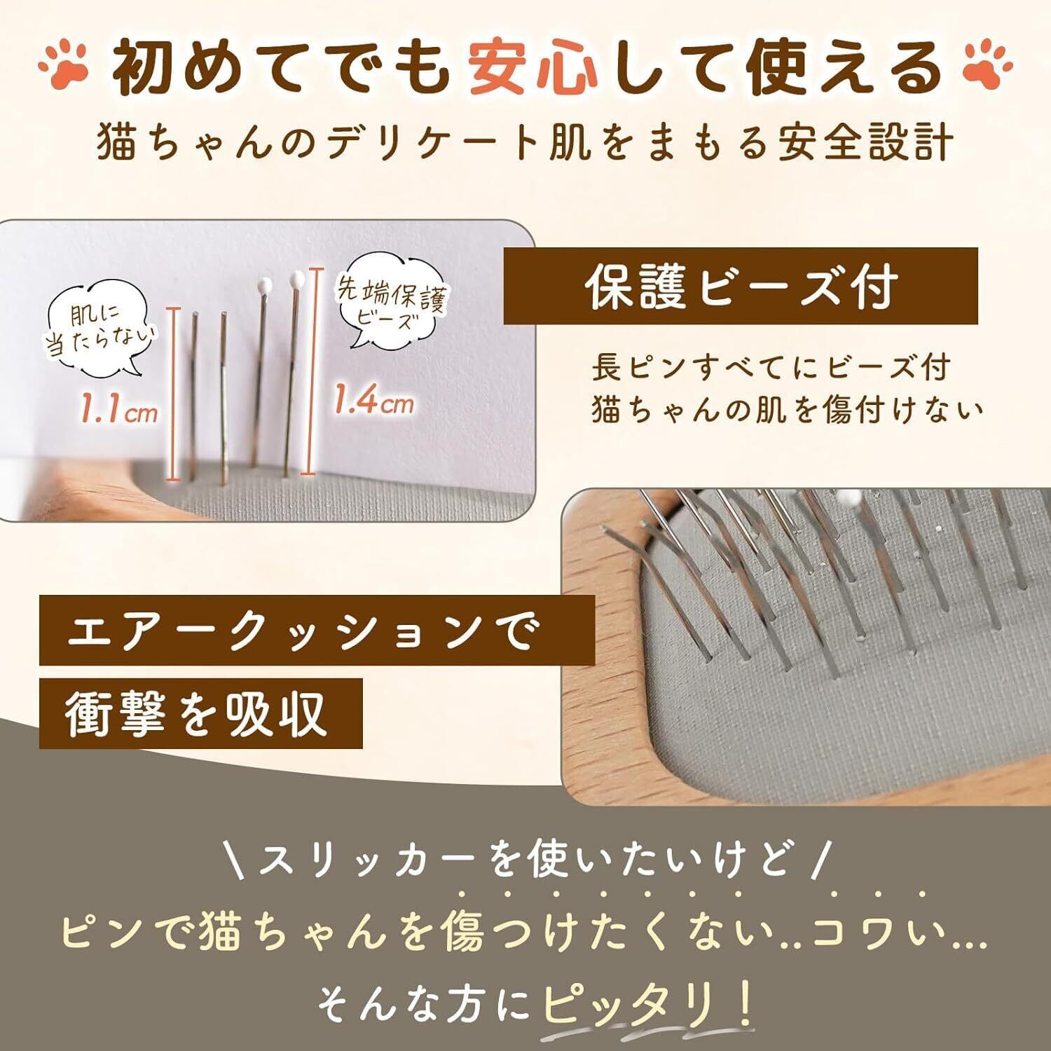 【猫ちゃんの肌を傷つけない】ブラッシング初心者の飼い主様も安心。丸型ビーズでピン先保護。エアークッションで衝撃吸収。猫ちゃんのデリケートな肌を傷つける事なくブラッシングいただけます。